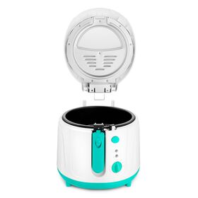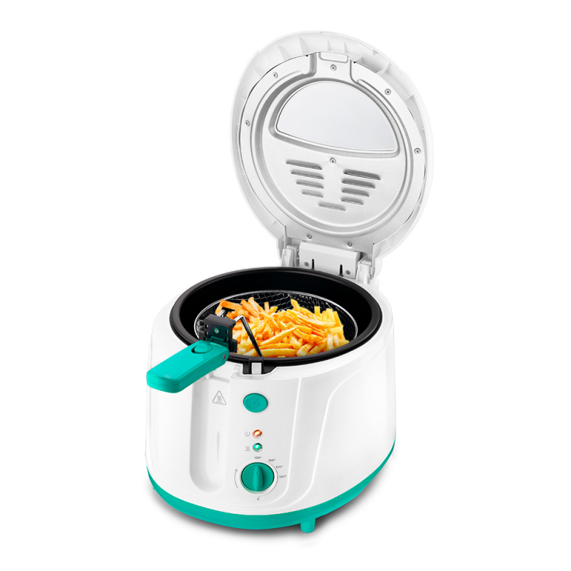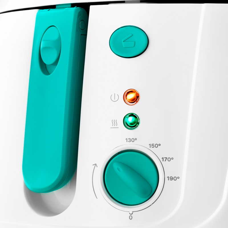 На передней панели расположен регулятор температуры, индикаторы питания и нагрева и кнопка открытия крышки. У фритюрницы есть защита от перегрева при приготовлении. При перегреве сработает термостат, который отключит фритюрницу от сети питания. Контролируйте процесс! Плотная крышка оборудована специальным смотровым окошком, через которое вы можете наблюдать за процессом приготовления. Никаких запахов В крышке фритюра есть вентиляционные отверстия закрытые фильтром, для того чтобы ослабить или предотвратить распространение запаха продуктов при приготовлении. Вместительная корзина