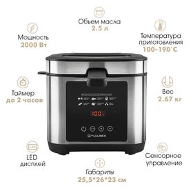 Регулировка температуры приготовления, Сенсорное управление, LED дисплей, Таймер до 2 часов, Корзина для фритюра с ручкой, Антипригарное покрытие чаши, Защита от перегрева, Съемная крышка, Прозрачное окошко на крышке, Индикатор работы