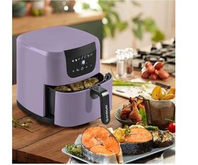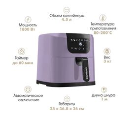 Аэрогриль оснащен сенсорным управлением и имеет 7 автоматических программ, благодаря которым вы можете приготовить картофель фри, пиццу, куриные крылышки, куриные ножки, стейки, креветки и рыбу. А также при желании, Вы можете вручную изменить время и температуру приготовления, что делает устройство еще более удобным в использовании.Мощность аэрогриля 1800 Вт и контейнер с антипригарным покрытием, объемом 4, 5 литра, позволяет приготовить необходимое количество блюда быстро и легко. Продукты помещаются на специальную съемную решетку, которая также имеет антипригарное покрытие.
