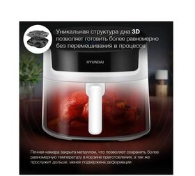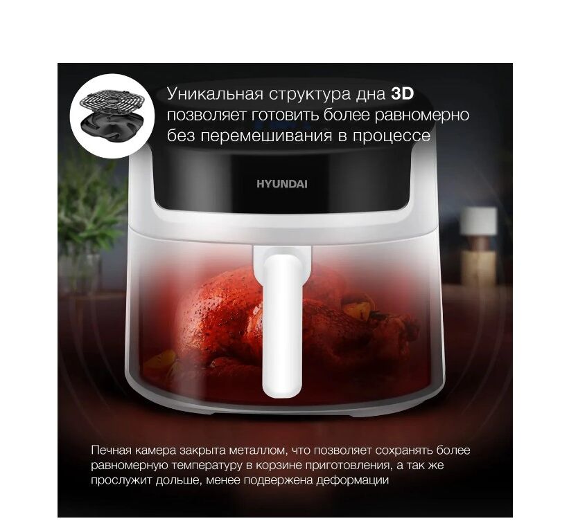 Инновационная форма дна корзины имеет спиральную форму, обеспечивает 3D прогрев всей камеры, благодаря этому вам больше не нужно переворачивать продукты, они будут приготовлены более равномерно снизу и сверху. Аэрогриль оснащён сенсорным управлением, он имеет 8 самых популярных автоматических программ, вам не придётся контролировать процесс приготовления лично, а так же ручным режимом где вы можете выбрать температуру и время приготовления самостоятельно.