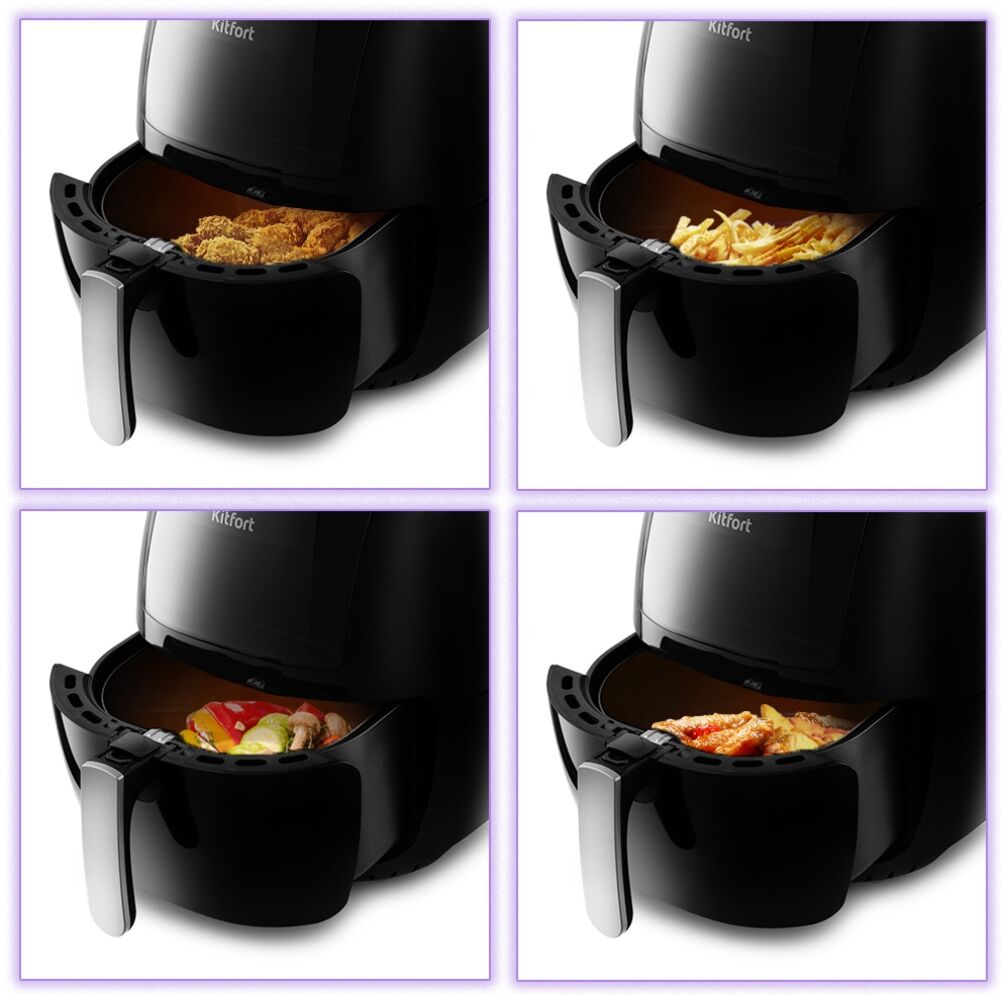 Аэрогриль Kitfort КТ-2220 может использоваться как аэрогриль, а также как аэрофритюрница и духовка и позволяет готовить большинство продуктов с минимальным количеством масла или вовсе без его добавления.