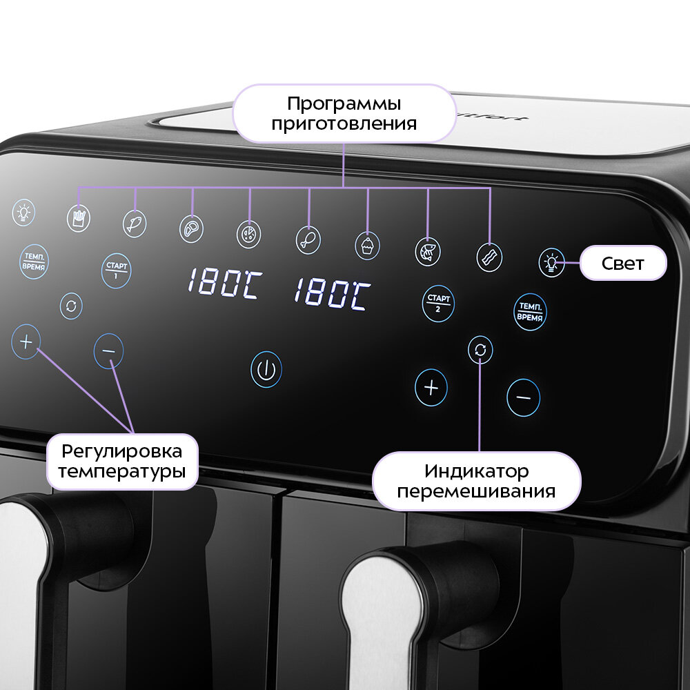 Аэрогриль имеет простое управление и 8 программами, а также функцию подогрева. Индикатор перемешивания покажет, когда стоит перемешать продукты, а функция подсветки позволит с легкостью наблюдать за происходящим внутри аэрогриля.