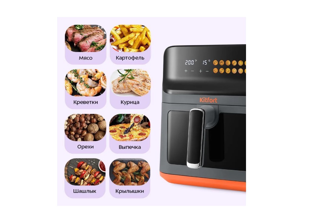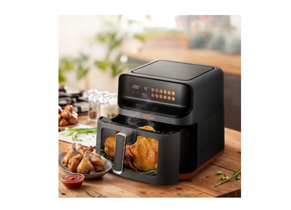 Современный аэрогриль КТ-8107 позволяет готовить большинство продуктов без добавления масла, при этом они получаются сочными и с хрустящей корочкой.
