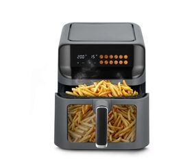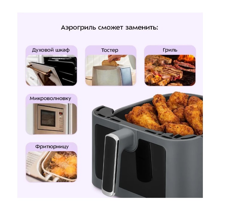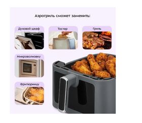 Он оснащён электронным управлением и имеет 9 автоматических программ, которые имеют свою температуру приготовления. Время готовки задаётся автоматически, исходя из веса продуктов. У аэрогриля есть таймер для более удобного использования.