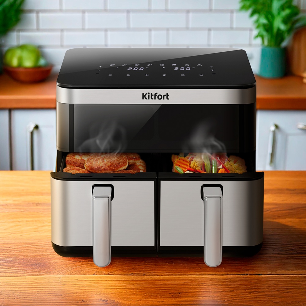 Главное преимущество аэрогриля — наличие 2 нагревателей и 2 поддонов. Это позволяет одновременно готовить 2 блюда, устанавливая для каждого свои настройки. Функция синхронизации времени окончания приготовления позволяет приготовить всё к одному времени.