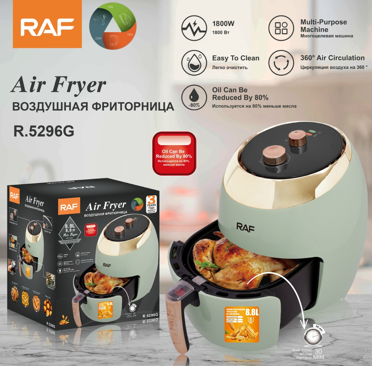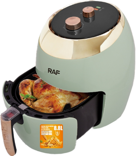 Аэрогриль Raf R.5296G обладает стильным дизайном и компактным корпусом овальной формы, за счет чего хорошо впишется на небольшой кухне. Устройство оснащено механической системой управления, с которой вы без труда установите желаемую температуру и время приготовления, адаптируя работу прибора под любой рецепт.