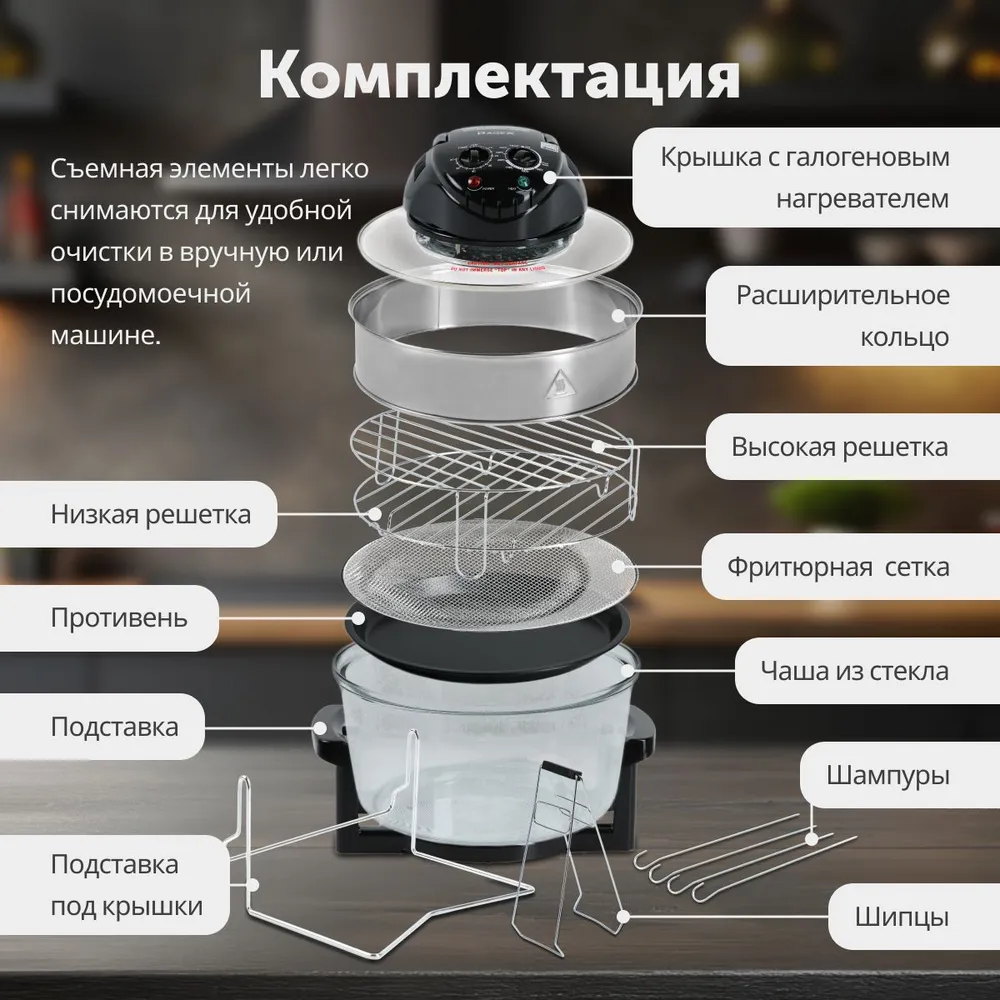 Аэрогриль со стеклянной жаропрочной чашей; Расширительное кольцо; Металлические щипцы для извлечения решетки; Низкая решетка для аэрогриля; Шампуры (4шт); Высокая решетка; Жаропрочный противень; Фритюрная сетка; Подставка для крышки; Руководство пользователя; Транспортировочная коробка + подарочная коробка