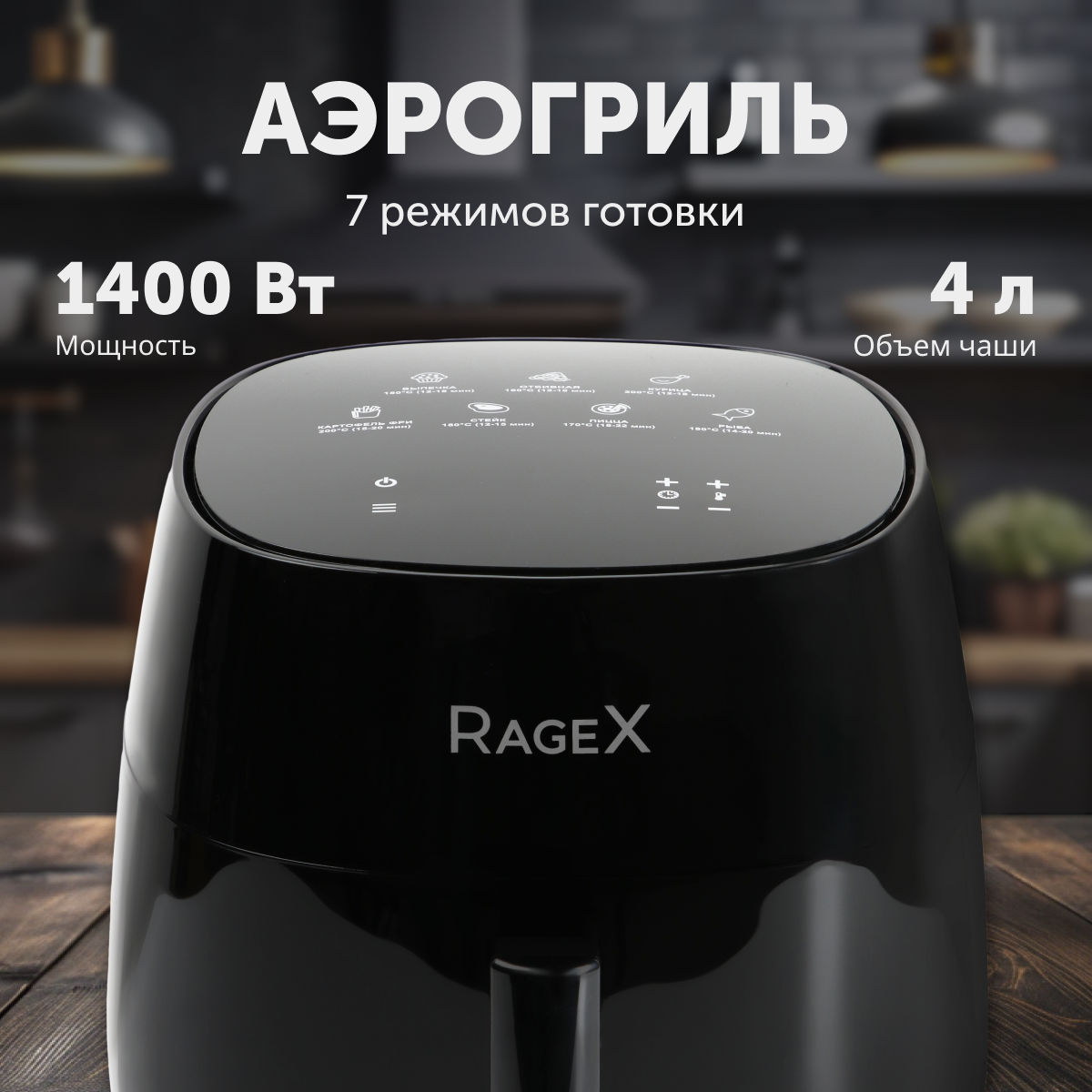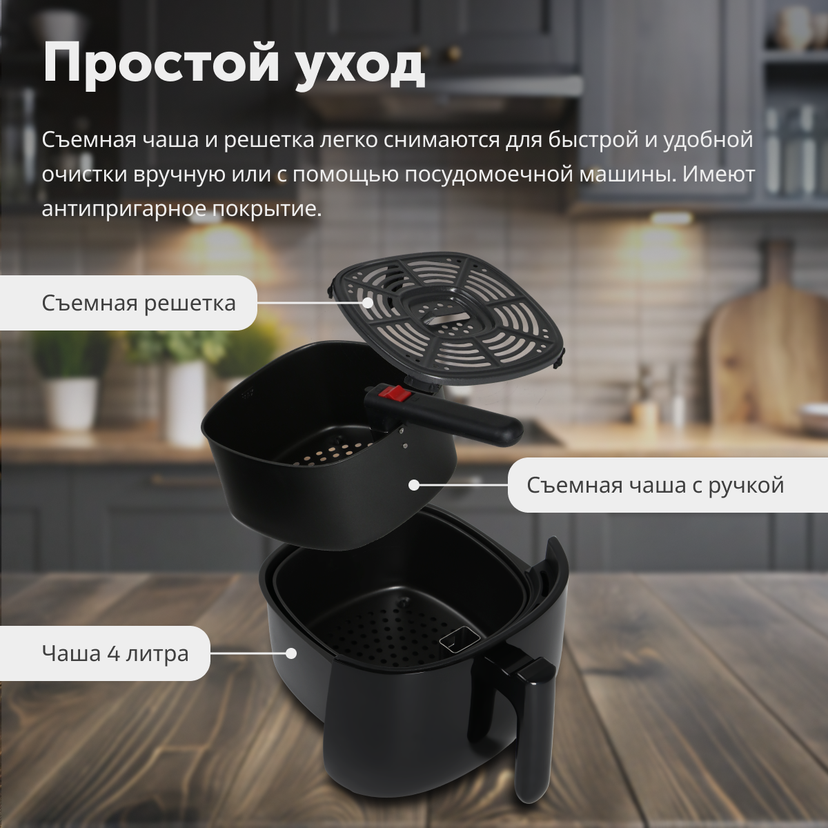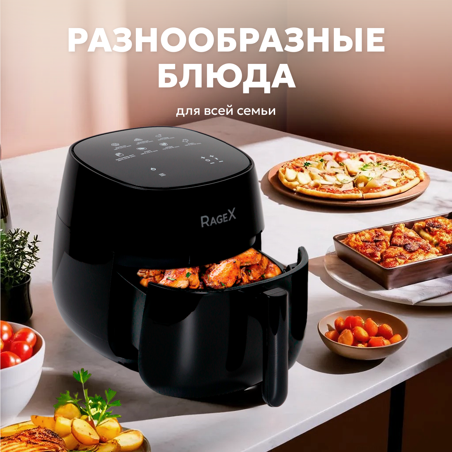 Аэрогриль с сенсорным управлением; Съемная чаша с ручкой; Решетка для жарки в электрофритюрнице; Руководство пользователя; Транспортировочная коробка + подарочная коробка