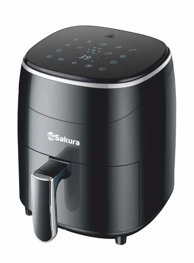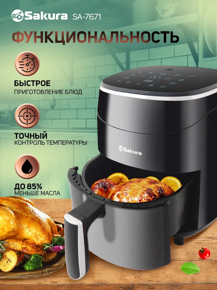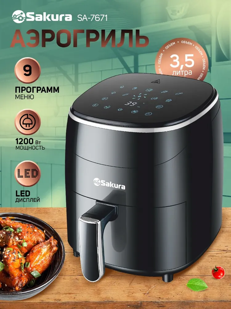 Аэрогриль, 1200 Вт, чаша с антипригарным покрытием 3,5 л, таймер на 60 минут, регулировка температуры 80-200С, сенсорное управление, LED дисплей, готовит без масла или с минимальным его использованием.
