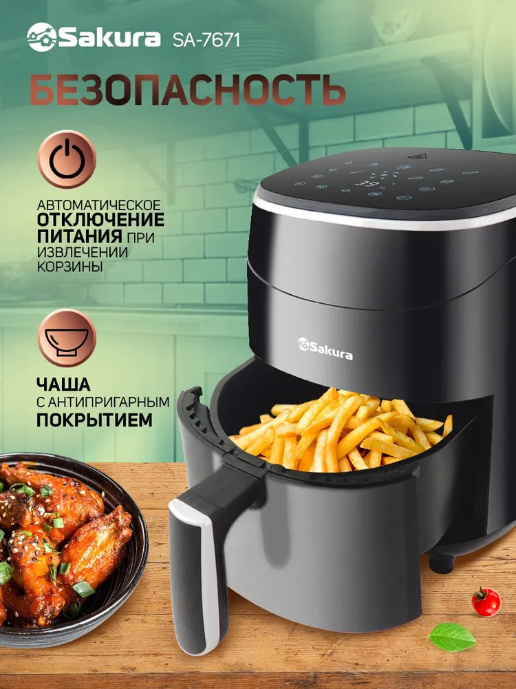 Автоматическое отключение питания при извлечении корзины, 9 предустановленных программ меню (орехи, картофель фри, хлеб, рыба, курица, брокколи, овощи, мясо, выпечка).