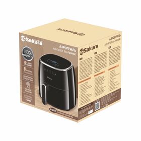 Аэрогриль, 1500 Вт, чаша с антипригарным покрытием 5,0 л, 8 программ приготовления, регулировка температуры от 80 °C до 200 °C, таймер на 60 мин, LED дисплей, сенсорное управление, автоматическое отключение питания при извлечении чаши. Размер устройства в упаковке: 310х310х332 мм. Цвет черный. Длина шнура 120см.