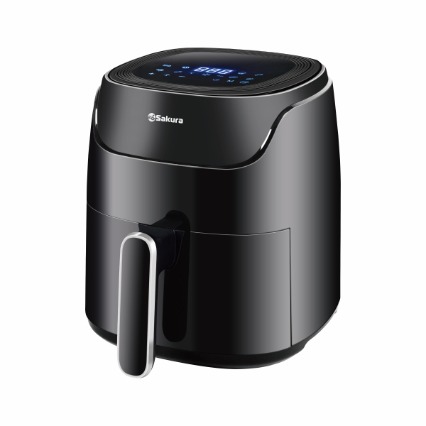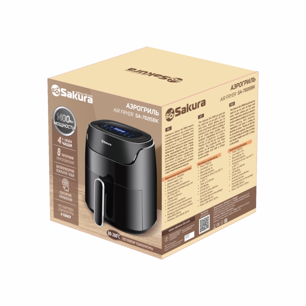 Аэрогриль, 1400 Вт, чаша с антипригарным покрытием 4,0 л, 8 программ приготовления, регулировка температуры от 80 °C до 200 °C, таймер на 60 мин, LED дисплей, сенсорное управление, автоматическое отключение питания при извлечении чаши. Размер устройства в упаковке: 295х295х318 мм. Цвет черный. Длина шнура 120см.