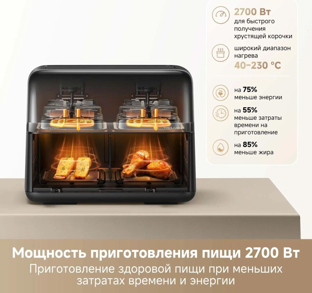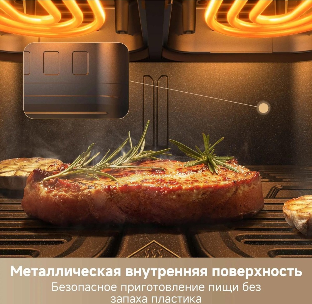 Гибкая система из двух зон, переключение на одну большую зону приготовления. Две независимые системы нагрева. Цельнометаллический внутренний корпус позволяет избежать запаха пластика во время нагрева . Диапазон температур 40-230°C позволяет приготовить блюда с точным контролем температуры.