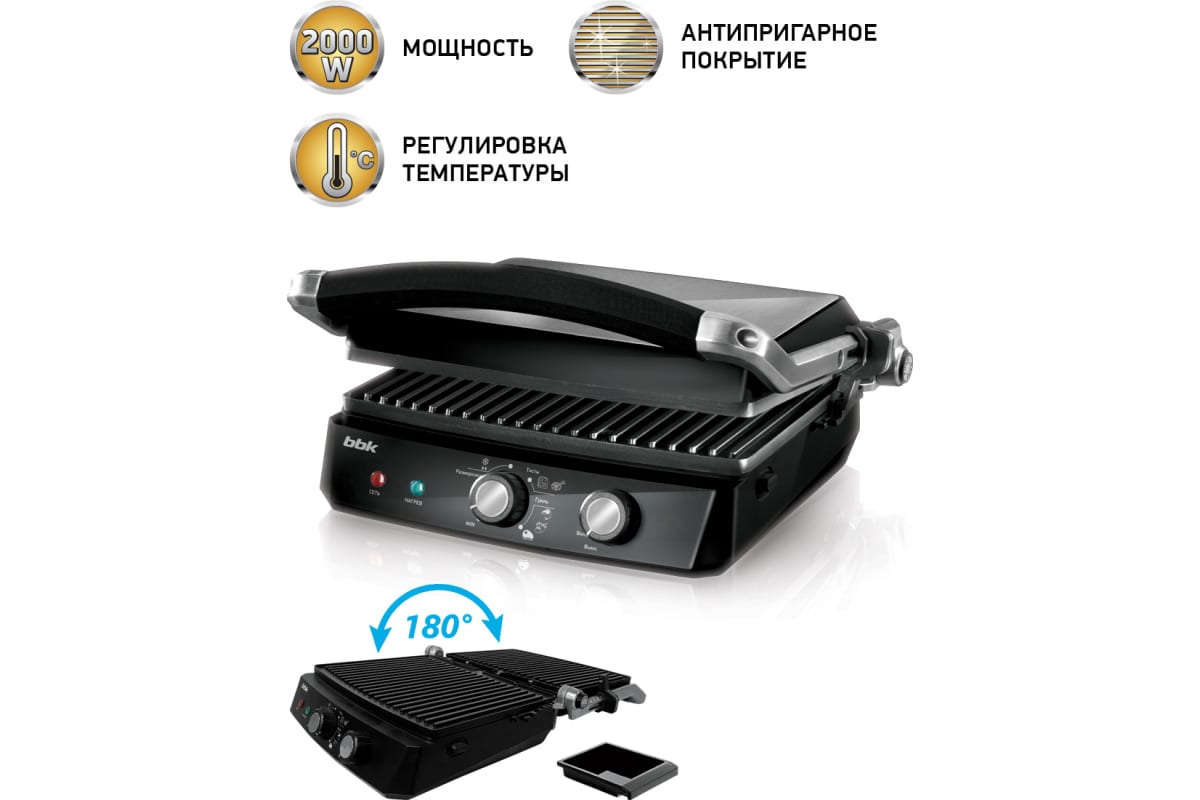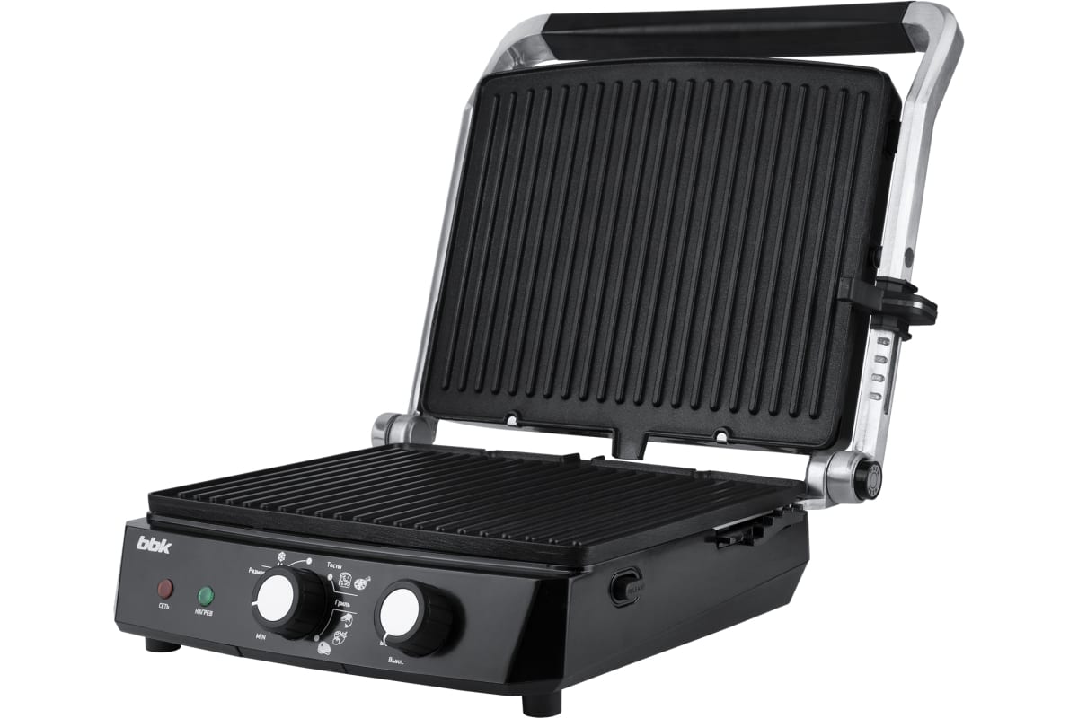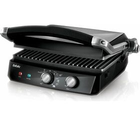 Электрический гриль bbk BEG2002 черный/металлик 00-00000380 позволяет качественно и быстро приготовить различные блюда из овощей, мяса, рыбы. Регулировка степени закрытия крышки с возможностью открытия на 180° позволяет использовать устройство как контактный гриль или открытое барбекю, тем самым расширяя кулинарные возможности. Функция регулировки температуры от 100 до 210°C, автоматический разогрев и защита от перегрева делают использование гриля комфортным и безопасным. Дополнительным плюсом модели являются размещенные на передней панели регуляторы включения/выключения устройства, а также выбора режима работы. Благодаря съемным нагревательным пластинам с антипригарным покрытием и маслоприемнику удобно мыть, а при хранении он не занимает много места.