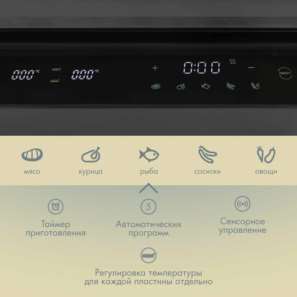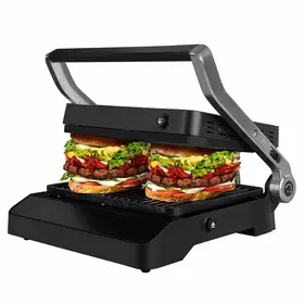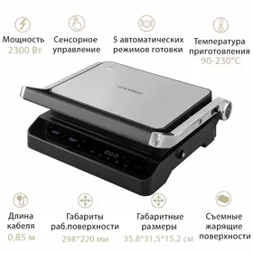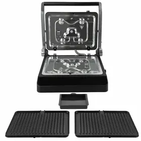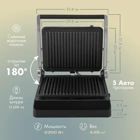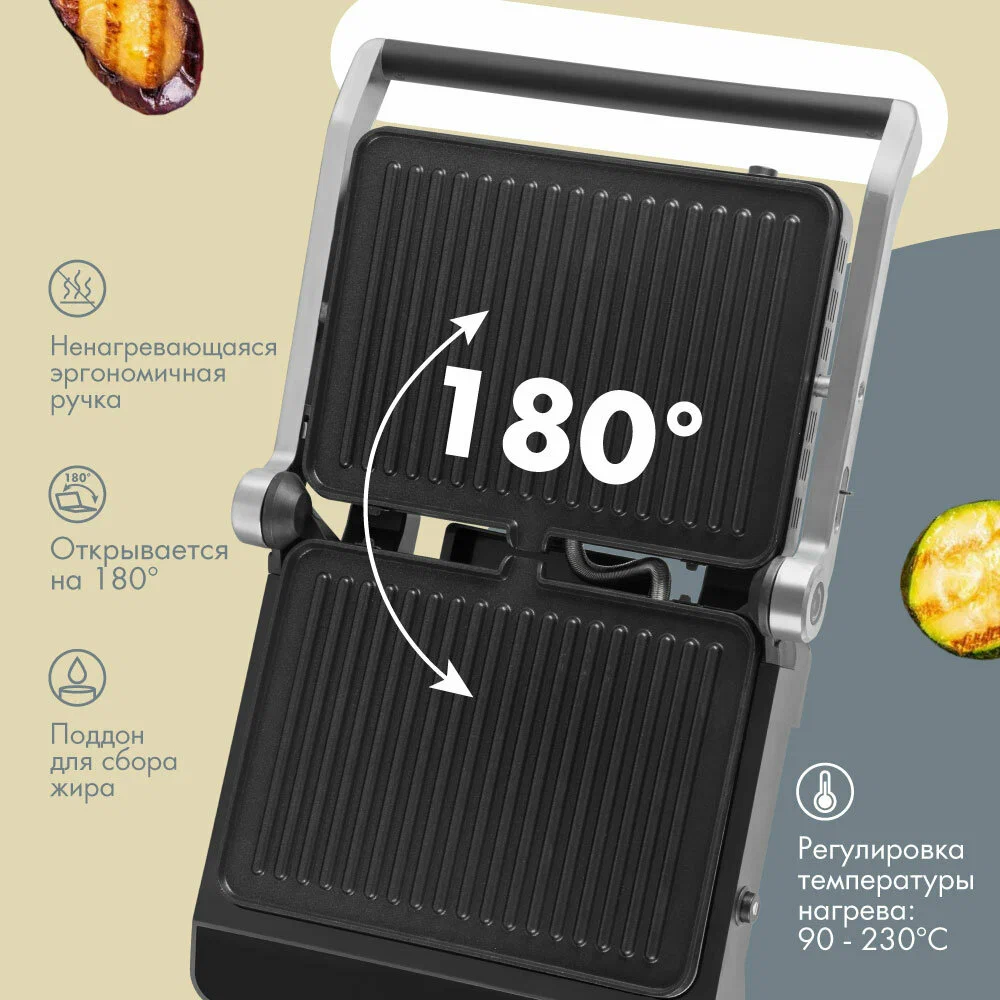 антипригарное покрытие, контактный гриль, поддон для сбора жира, съемные пластины, Раскрытие на 180°
