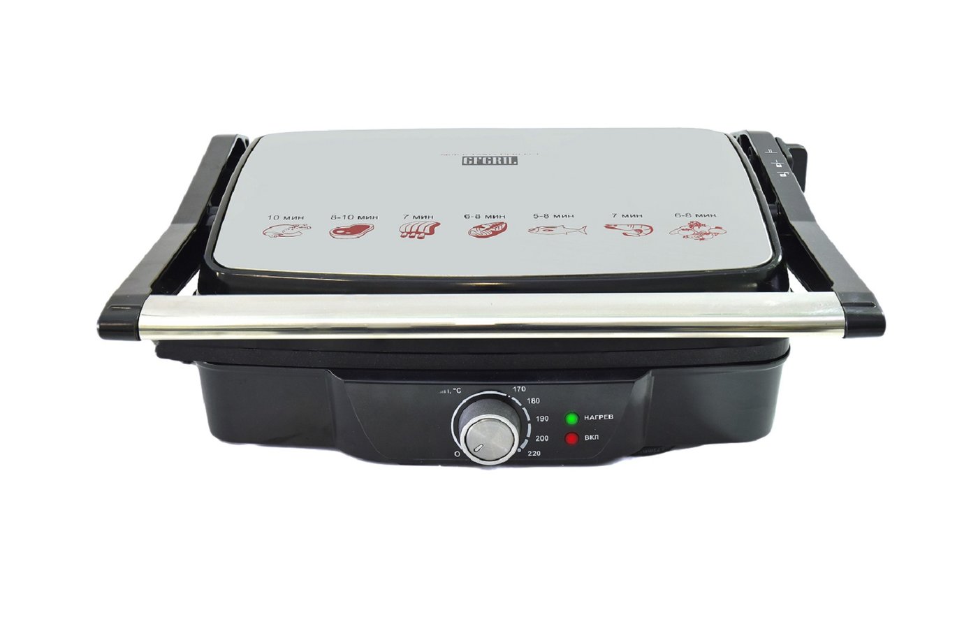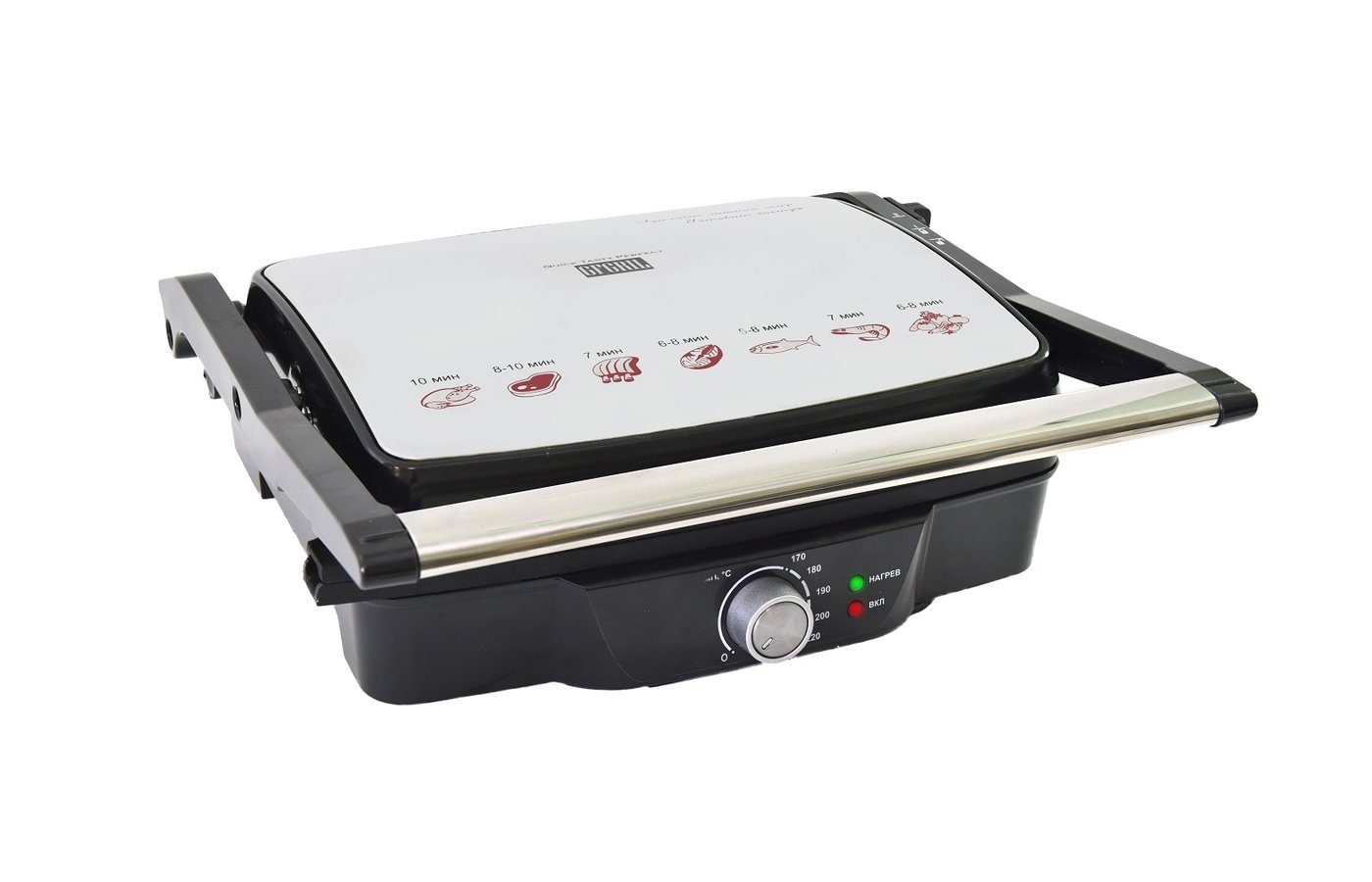 Мощность электрогриля 2000 Вт. Гриль оснащен ненагревающейся ручкой.