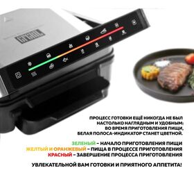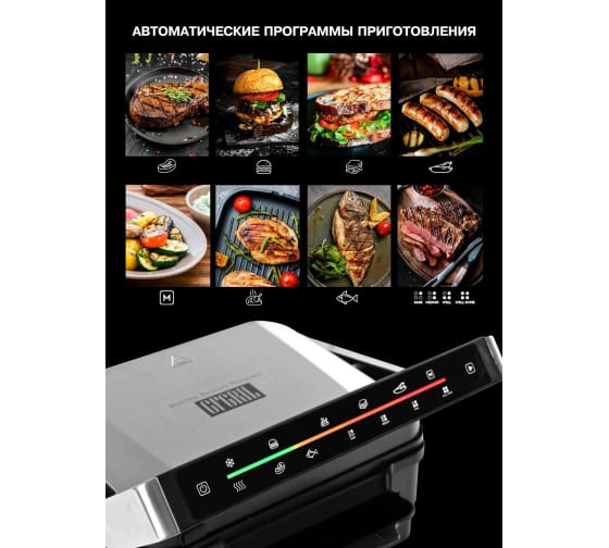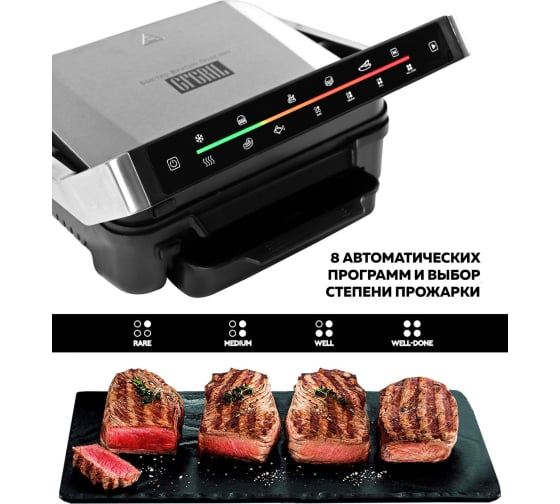 Семь автоматических режимов приготовления дают возможность одним нажатием включить гриль на оптимальной для данного продукта температуре и времени, а для программ «Мясо» и «Рыба» можно также задать одну из 4-х степеней прожарки (RARE, MEDIUM, WELL, WELL-DONE).