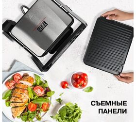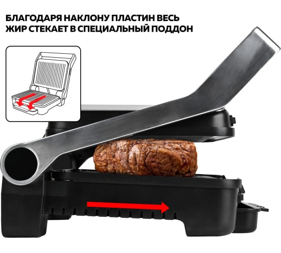 Панели электрогриля легко снимаются, и их удобно мыть в посудомоечной машине. К тому же панели расположены под наклоном, чтобы выделяющиеся в процесс приготовления из продуктов жир и влага, стекали в специальный поддон. Это удобно, если, например, вы готовите жирное мясо. Поддон съемный и его также можно мыть в посудомоечной машине.