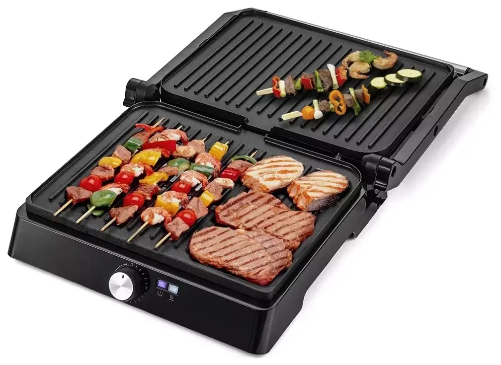 антипригарное покрытие, крышка, поддон для сбора жира, Раскрытие на 180°, раскрытие на 180°, съемная жарочная поверхность