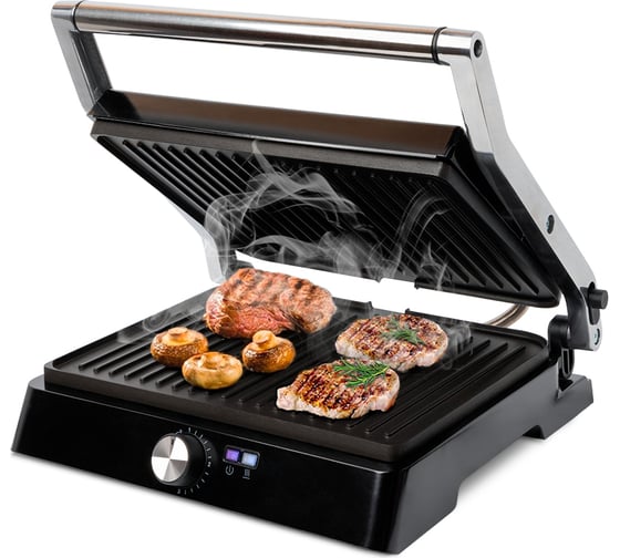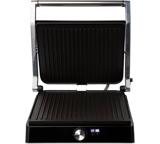 Электрогриль оснащён термостатом для поддержания постоянной температуры панелей и индикаторами, показывающими наличие питания, а также включение и отключение нагрева.