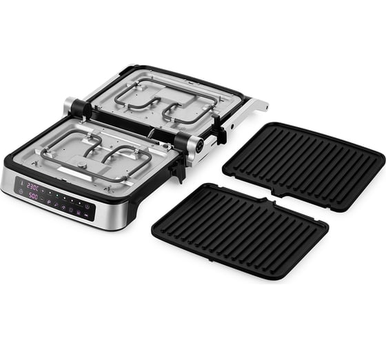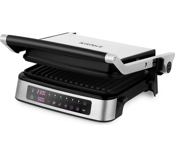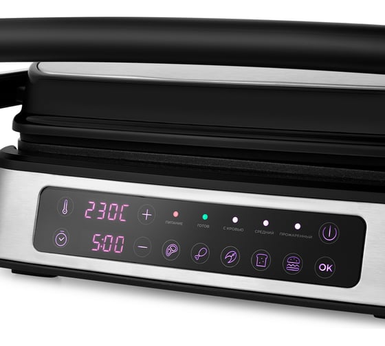 Электрогриль оснащен термостатом для поддержания постоянной температуры панелей, а также панелью управления.