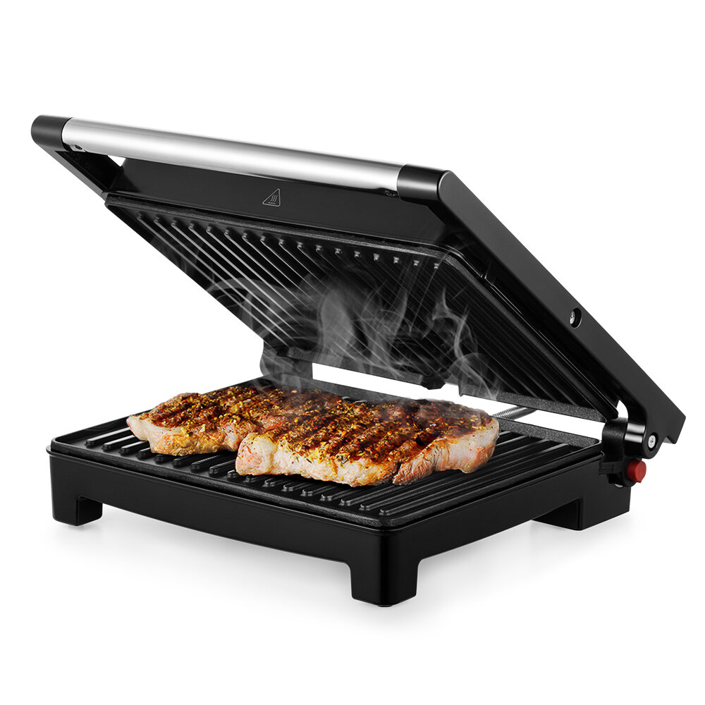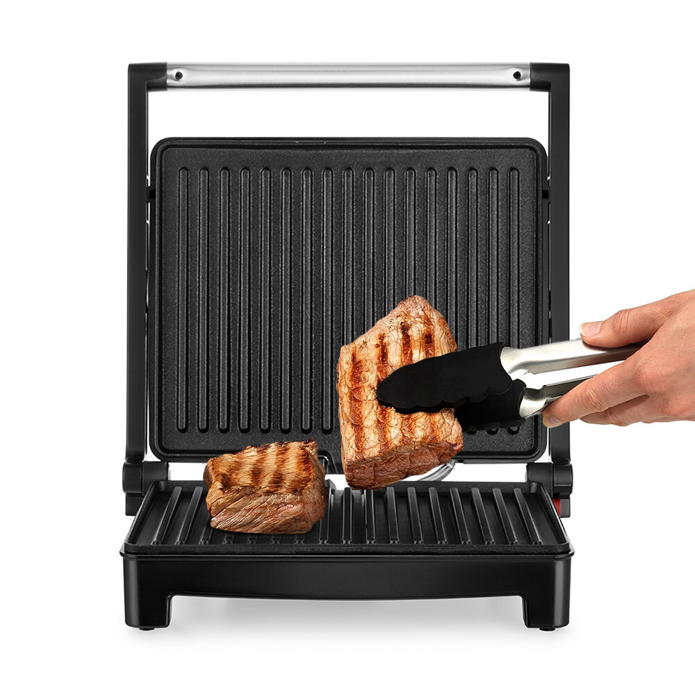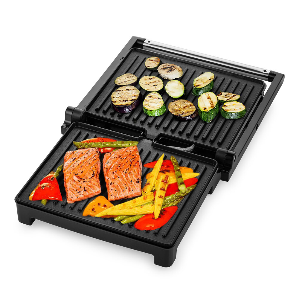 Конструкция гриля позволяет готовить в двух режимах: двустороннем и одностороннем. В двустороннем режиме электрогриль закрывается крышкой, так что продукты находятся между двух нагреваемых панелей и готовятся с двух сторон сразу. Такой способ позволяет сократить время готовки, а также не требует переворачивания продуктов во время приготовления. В одностороннем режиме крышка гриля откидывается на 180°, благодаря чему гриль превращается в большую жаровню, а продукты можно выложить сразу на две панели.