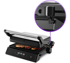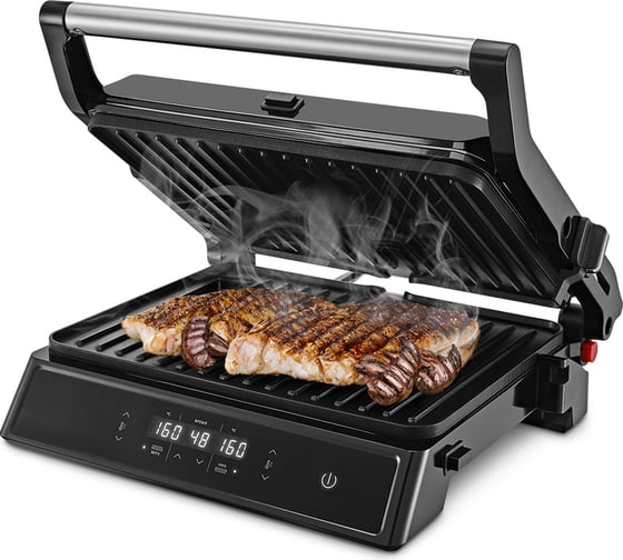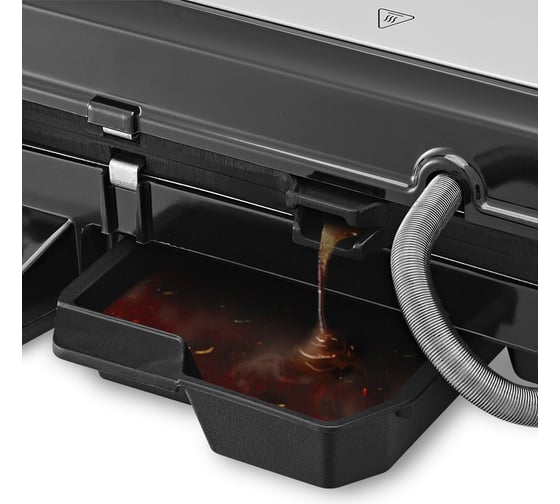 Конструкция гриля позволяет готовить в трех режимах: двустороннем, одностороннем и с приоткрытой крышкой. В двустороннем режиме гриль закрывается крышкой, благодаря чему продукты находятся между двух нагреваемых панелей и готовятся с двух сторон. В режиме приготовления с приоткрытой крышкой верхняя нагреваемая панель опускается не до конца, что полезно при готовке продуктов, которые могут потерять форму из-за давления крышки. В одностороннем режиме крышка гриля откидывается на 180°, благодаря чему гриль превращается в большую жаровню, а продукты можно выложить сразу на две панели. Данная модель оснащена поддоном для слива жира и сока, которые выделяются в процессе приготовления продуктов.