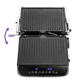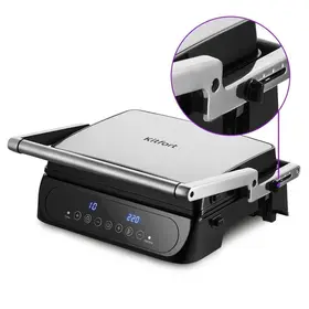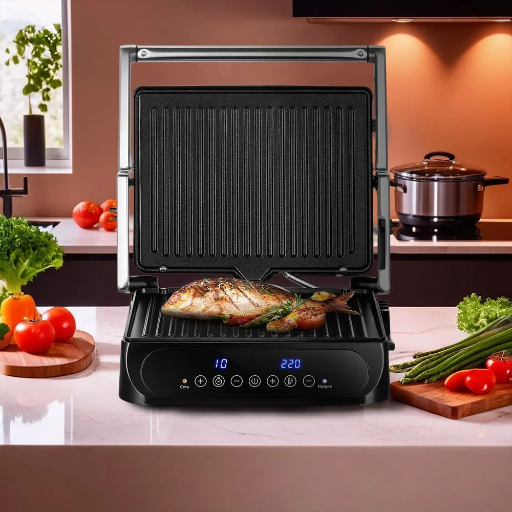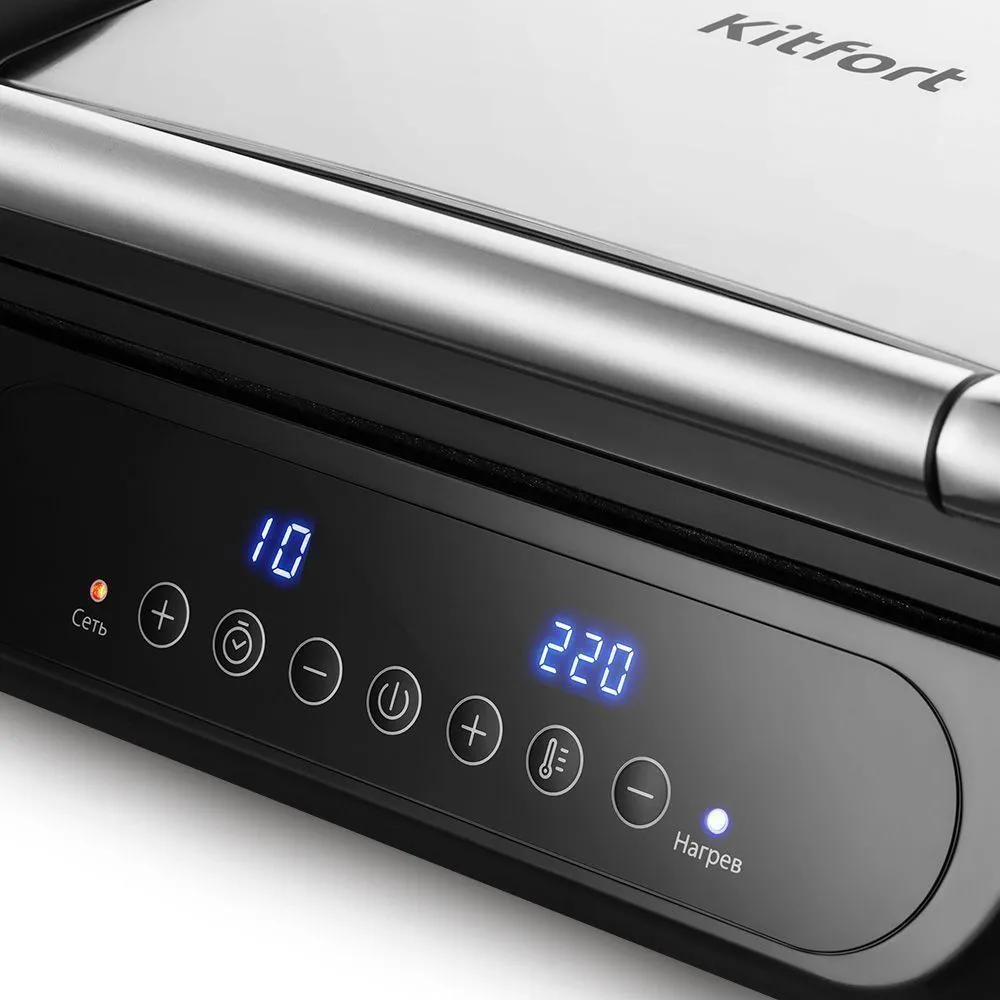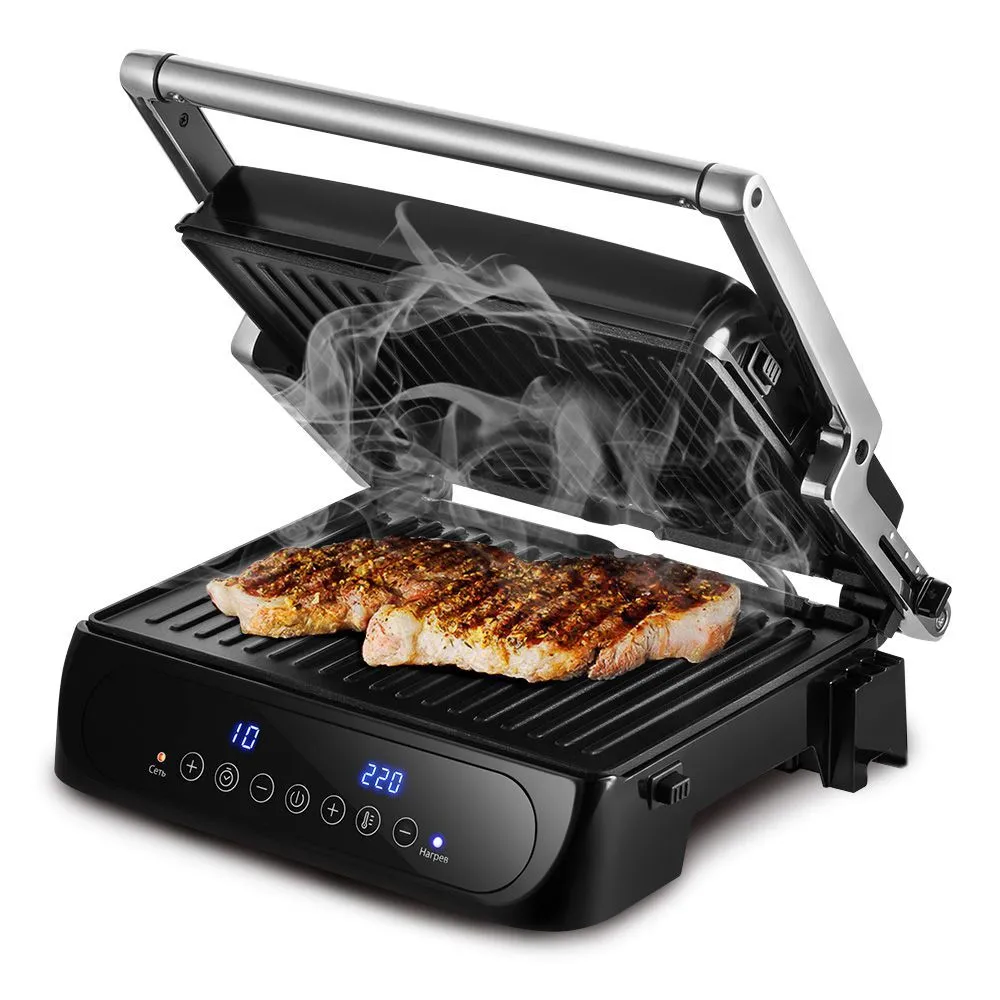 Электрогриль позволяет регулировать время и температуру приготовления, а также гриль оснащён дисплеем и термостатом для поддержания температуры панелей.