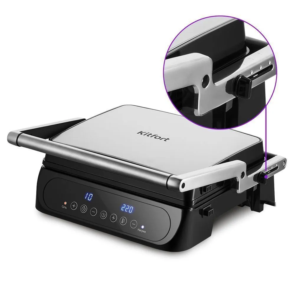 Электрогриль оснащён специальным фиксатором сбоку, что позволит вам зафиксировать крышку в приоткрытом положении на разных уровнях.