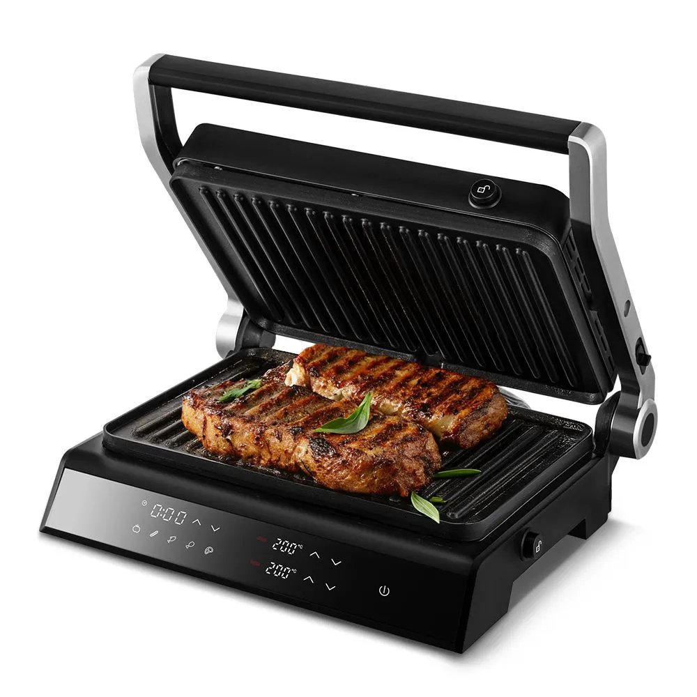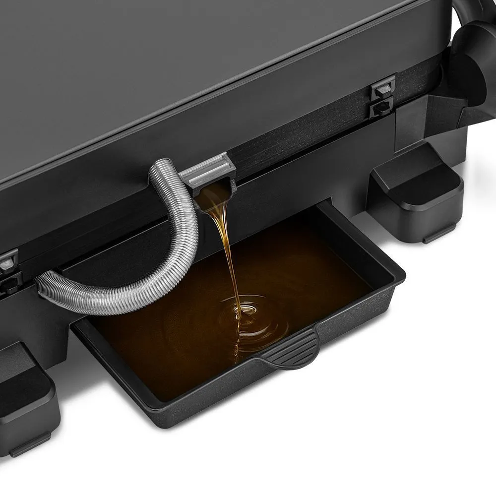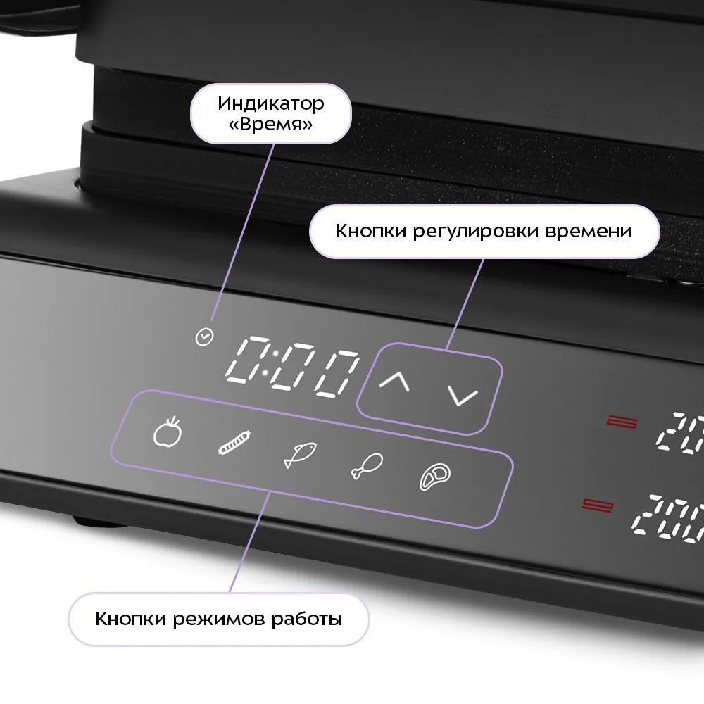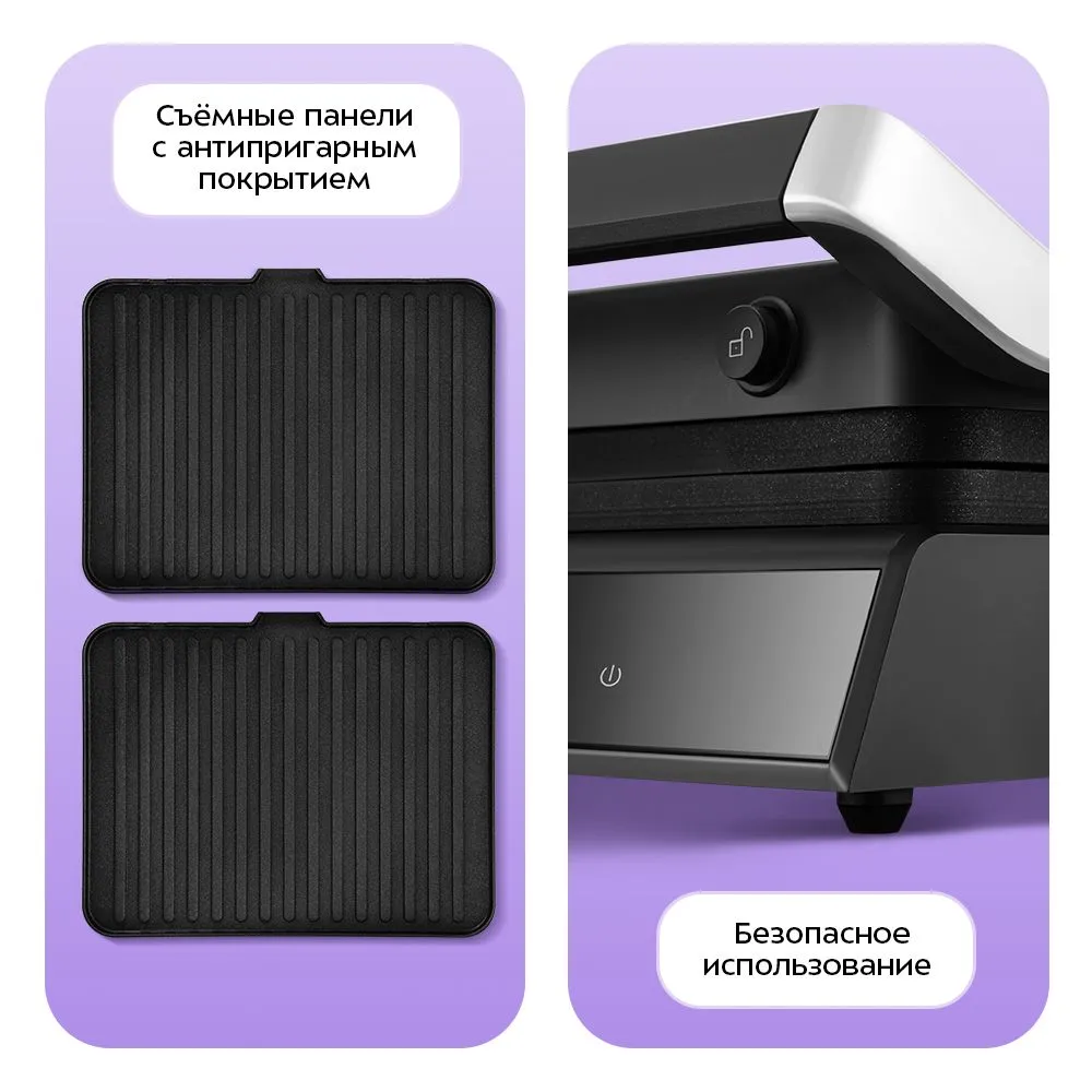 Конструктивные особенности тепловых приборов: Антипригарное покрытие, Поддон для сбора жира, Раскрытие на 180°, Сменные панели для приготовления