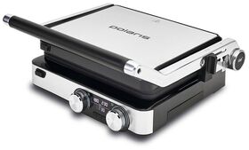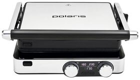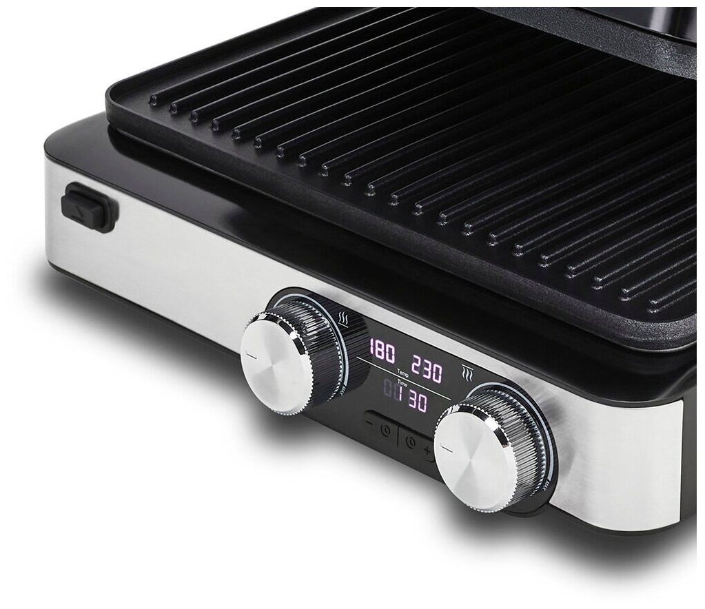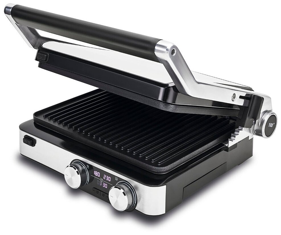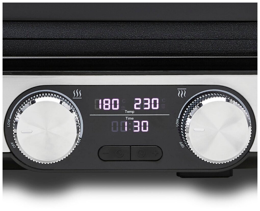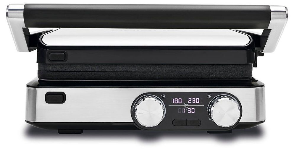 материал корпуса: нержавеющая сталь; таймер на 90 минут; 2 съемные панели с антипригарным покрытием; размер панелей: 29×23 см; встроенный в панели нагревательный элемент; электронная регулировка температуры верхней и нижней панелей до 230⁰ С