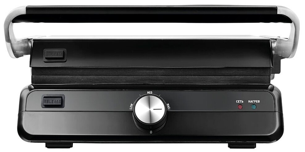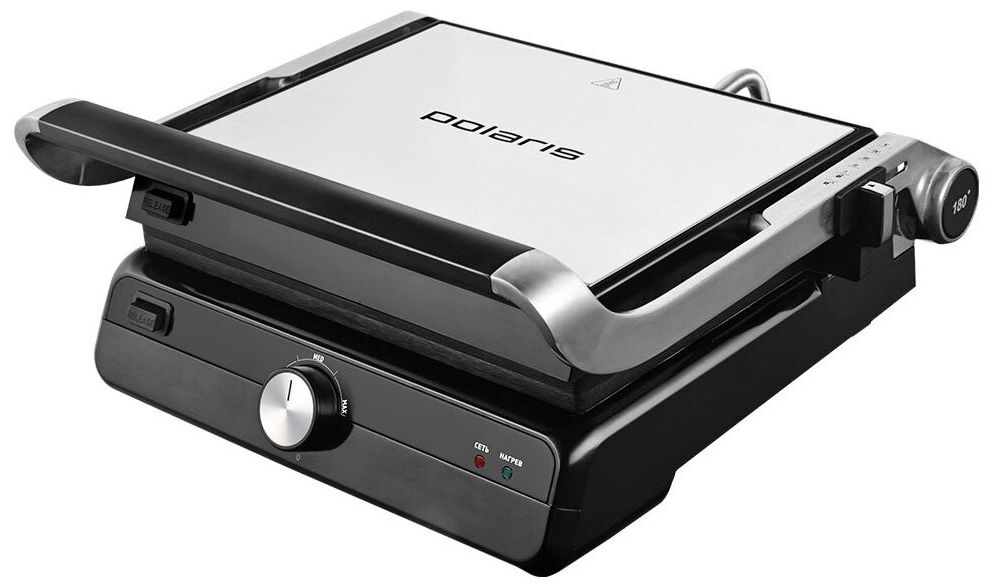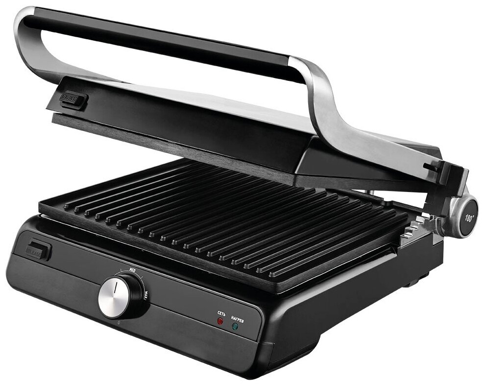 антипригарное покрытие, регулировка высоты верхней панели, поддон для сбора жира, контактный гриль, решетка