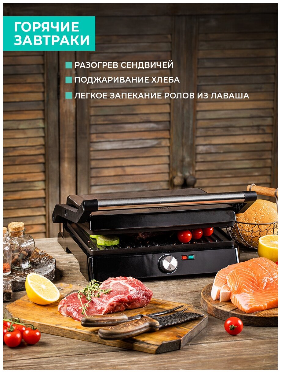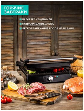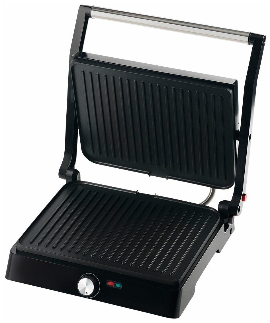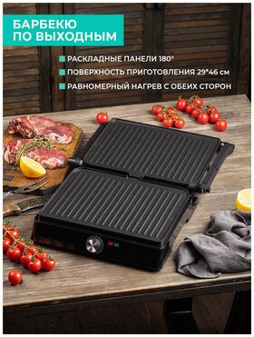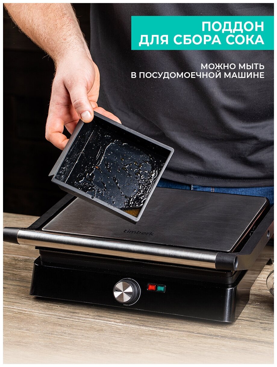 Почувствуй многообразие вкусов с грилем Timberk! Благодаря антипригарному покрытию панелей, готовить блюда можно без масла, поэтому пища получается легкой и низкокалорийной. Мощность 2200 Вт и регулятор температуры обеспечивают качественную прожарку мяса. Открытие панелей на 105 и 180° позволяют увеличить площадь приготовления блюд и уменьшить длительность процесса приготовления. Размер панелей 29х23 см, поэтому Вы сможете приготовить ужин для всей семьи за одно использование, например, поджарить котлеты, креветки, филе рыбы.В комплект прибора входят многофункциональный антипригарный коврик размером 40х33 см и съемный поддон для сбора мясного сока, которые максимально упрощают процесс очистки прибора.