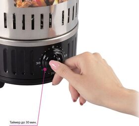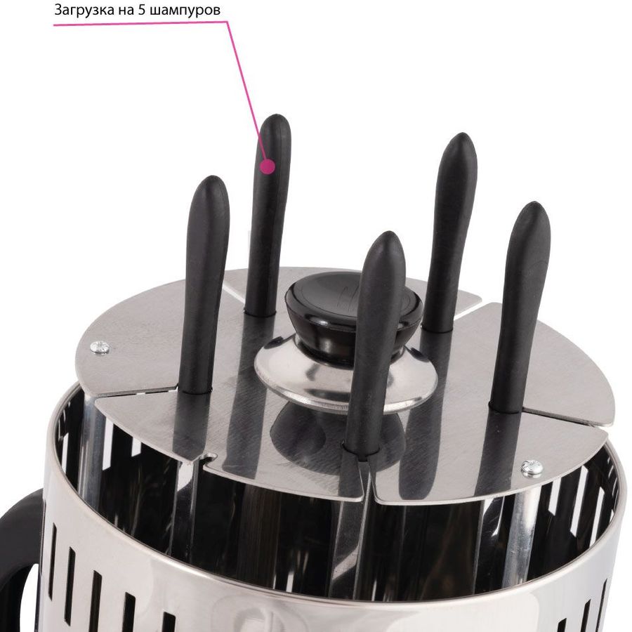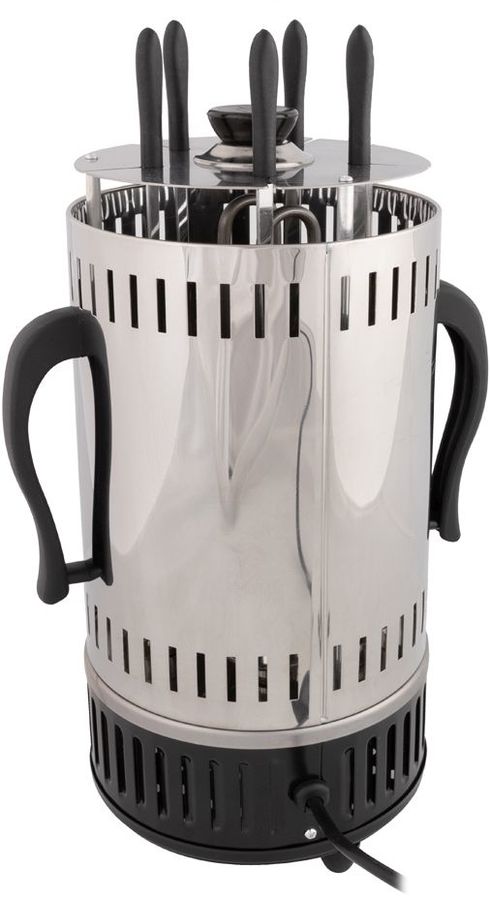 Корпус из нержавеющей стали. Загрузка на 5 шампуров. Таймер до 30 мин. Удобные ненагревающиеся ручки. Автоматическое вращение шампуров. Быстрое приготовление. Легкая очистка.