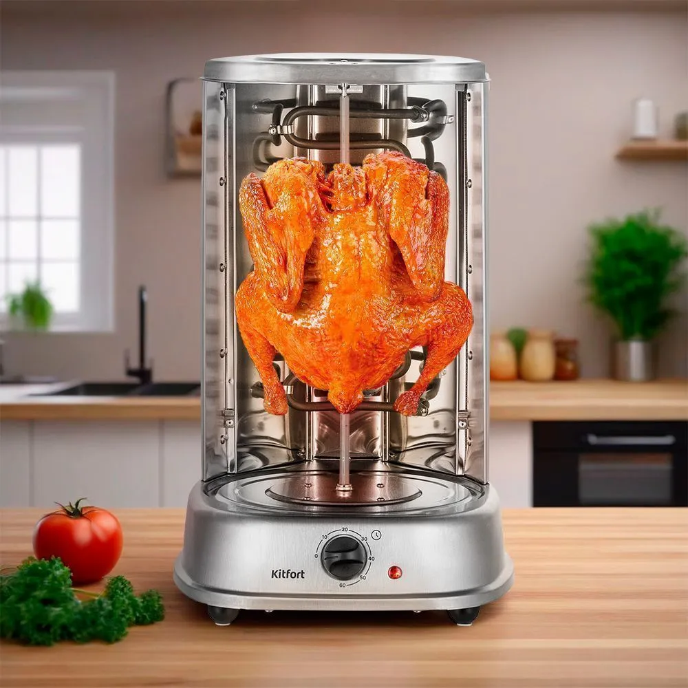 Электрошашлычница КТ-1410 позволит приготовить шашлык из мяса, рыбы или овощей, а также шаверму (шаурму), сардельки, сосиски, картофель, курицу гриль, гренки и другие блюда на вертеле или шампурах.