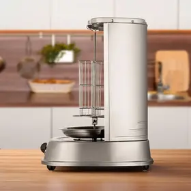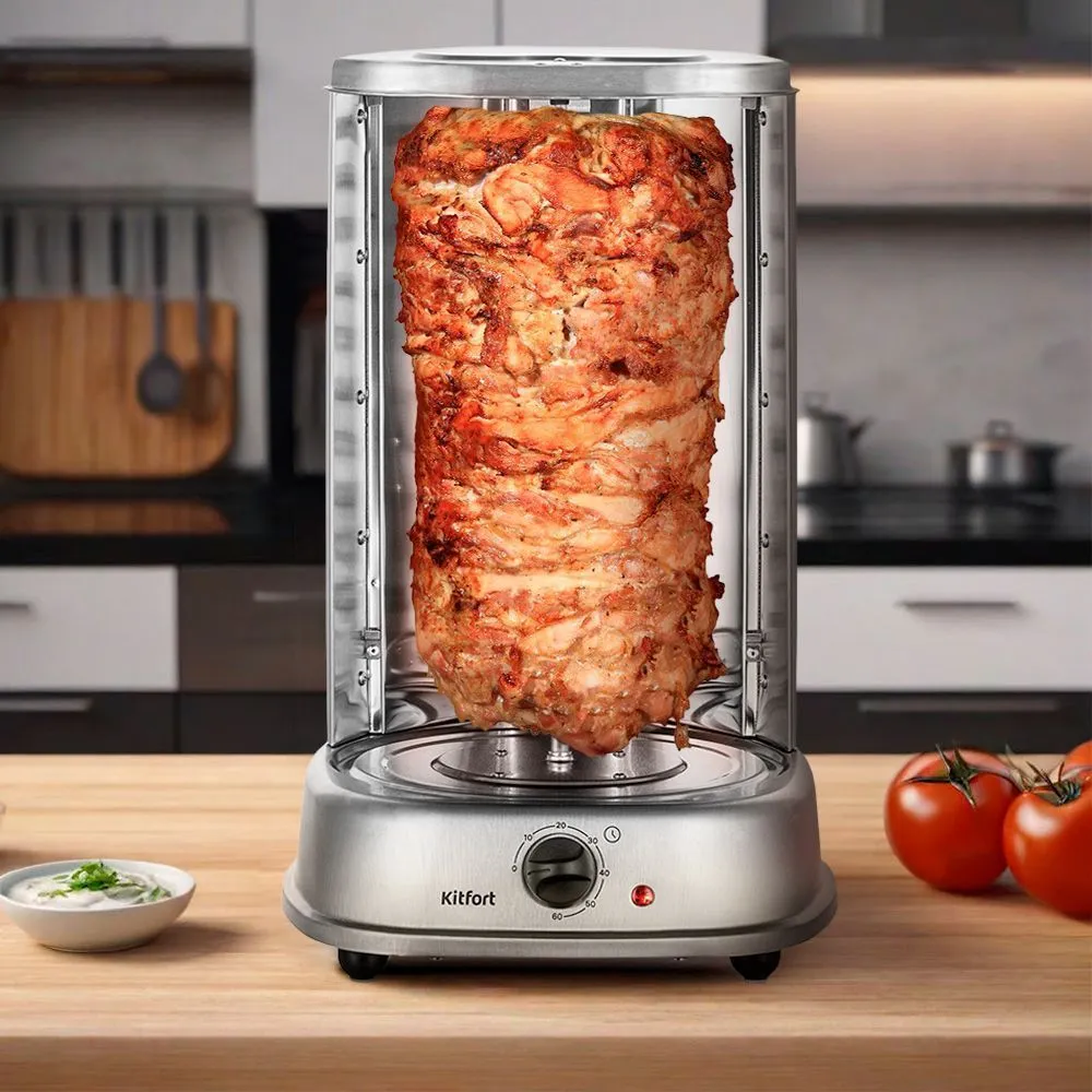 Помимо целой курицы-гриль, приготовьте домашнюю шаверму. На центральный шампур насаживается мясо, оно будет вращаться вокруг нагревательных элементов. Готовое мясо срежьте ножом, оно упадёт на поддон, где вы возьмёте его для шавермы и других блюд.