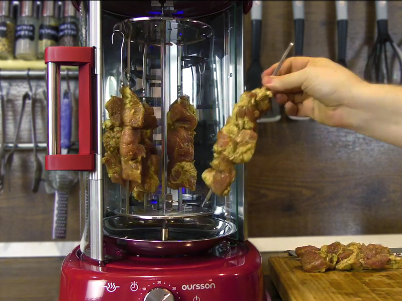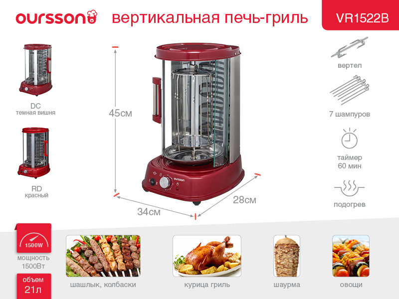 Вертикальная многофункциональная печь-шашлычница VR1522B объемом 21 л станет любимым кухонным прибором. В любую погоду вы сможете порадовать себя и близких сочной курицей-гриль, горячим шашлыком или вкусным люля-кебабом на шампурах. Высокая мощность 1500 Вт, нагревательный элемент ТЭН, а также дверца из термостойкого стекла позволяют получить циркуляцию горячего воздуха вокруг продукта, что делает его вкусным, полезным и румяным, а корочку хрустящей. Таймер на 60 мин с автоматическим отключением позволяет задать время приготовления, а звуковой сигнал известит о завершении приготовления. В приборе также предусмотрен режим сохранения продукта теплым на половине мощности. В комплекте есть вертел с зажимами, 7 шампуров, поддон для капель.