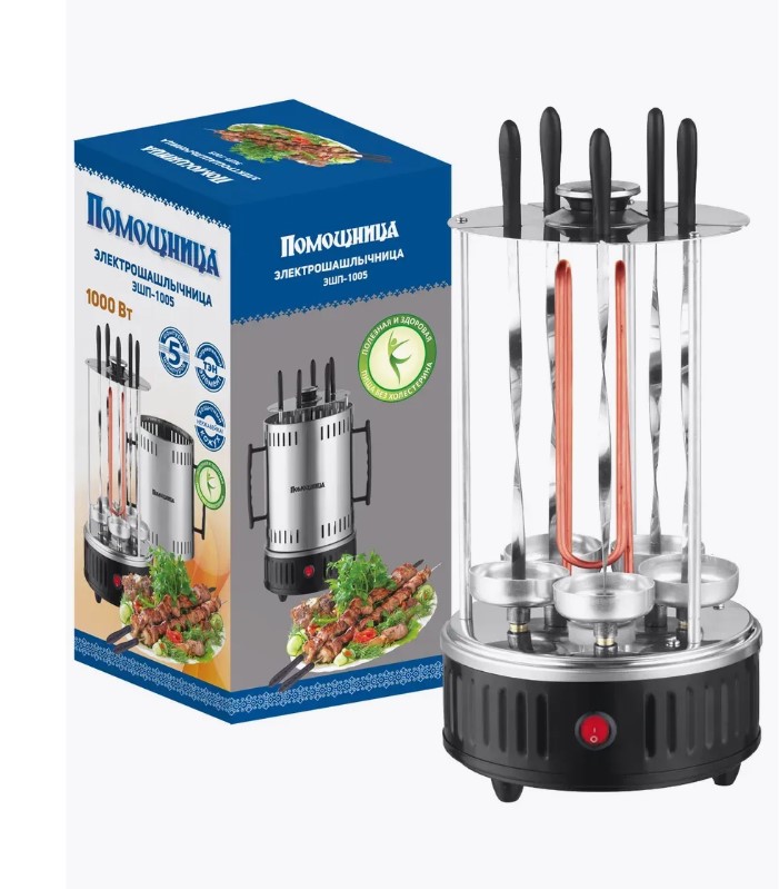Комплектация шашлычница; 5 шампуров; 5 чашей для сбора жира; защитный кожух; Руководство