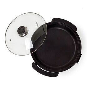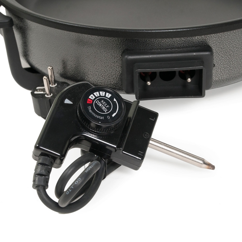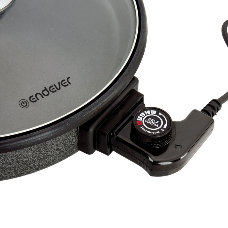 Сковорода обладает съемным термостатом с регулятором температуры, а также предусмотрена индикация работы. Сковорода может нагреваться до 240°C.