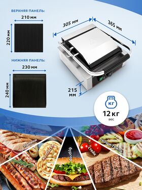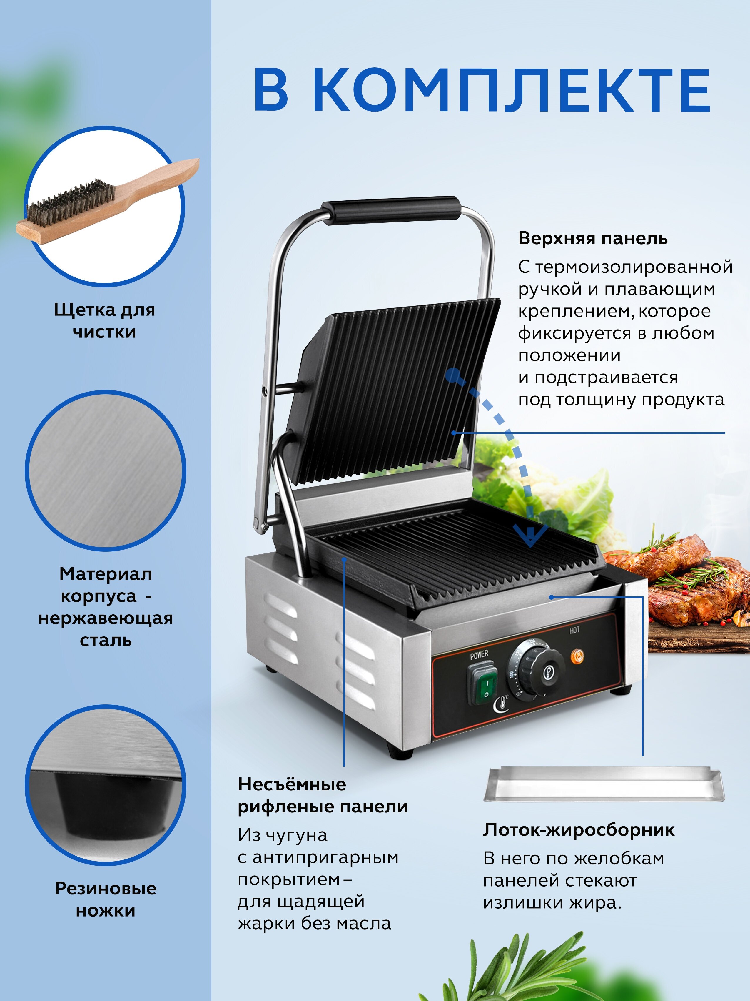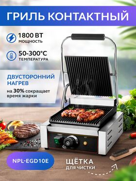 Пресс гриль электрический Gastrorag NPL-EGD10E - это компактная и недорогая техника для приготовления блюд на профессиональной кухне. С помощью контактного электрогриля можно быстро приготовить аппетитные горячие бутерброды панини, колбаски, овощи-гриль, бургеры, стейки и многое другое. Гриль для мяса оснащен двумя несъемными рифлеными панелями из чугуна с антипригарным покрытием, которые обеспечивают равномерный нагрев продуктов без подгорания. Размер панели 21,5 х 21,5 х 2 см. Благодаря двухстороннему нагреву время жарки в электро гриле сокращается примерно на 30%. Верхняя панель снабжена удобной термоизолированной ручкой, с помощью которой легко поднимается и устойчиво держится в любом положении, а также «плавающим» креплением, которое позволяет подстроиться под толщину продукта. Рифление создает более щадящий режим жарки по сравнению с гладкой поверхностью. Кроме того, излишки жира стекают в канавки и могут быть удалены в лоток-жиросборник. Это делает мясные блюда, приготовленные на гриле барбекю, более полезными. Обжаренные продукты приобретают характерный для гриля полосатый рисунок. В комплект входит специальная щетка для очистки панелей кухонного девайса. Корпус грильницы изготовлен из нержавеющей стали.