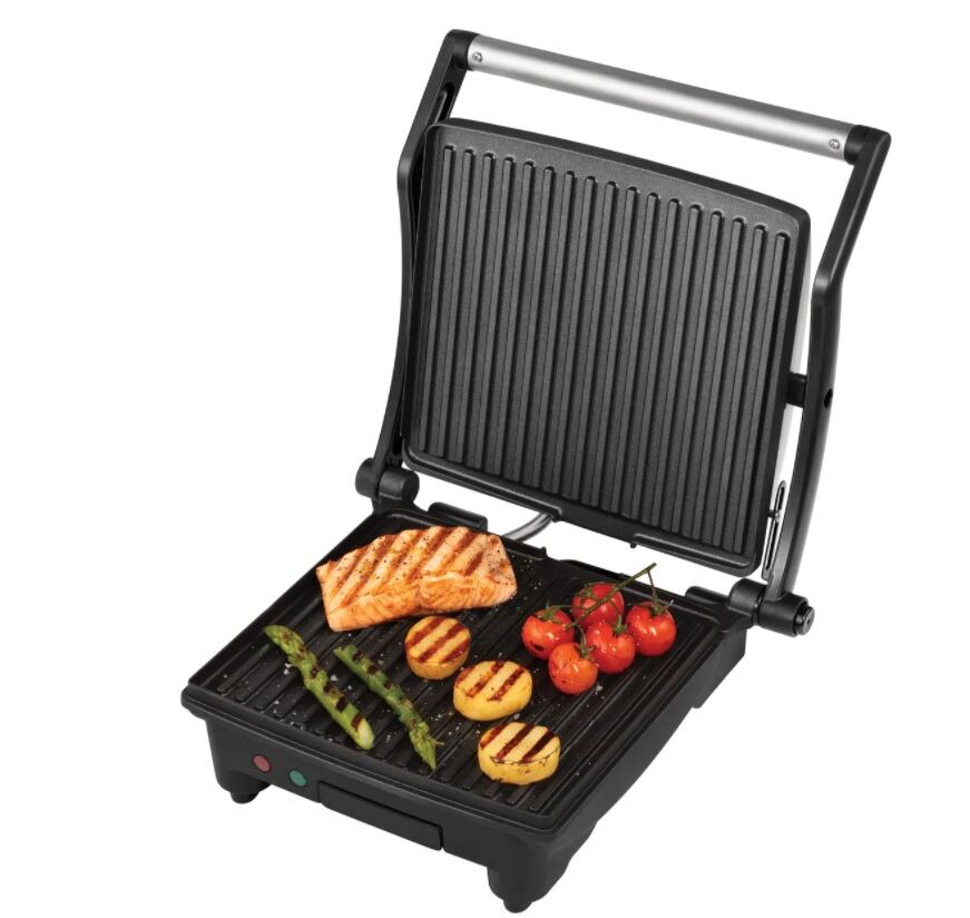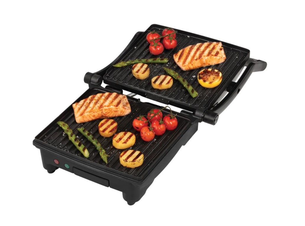 Конструкция гриля позволяет разворачивать поверхности на 180 градусов, удваивая место под приготовление блюд.