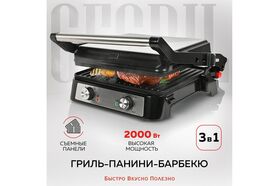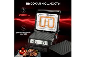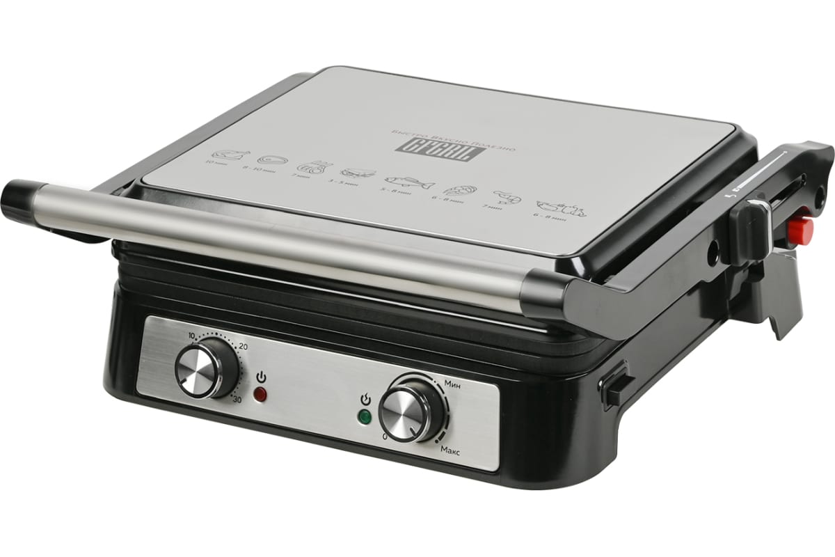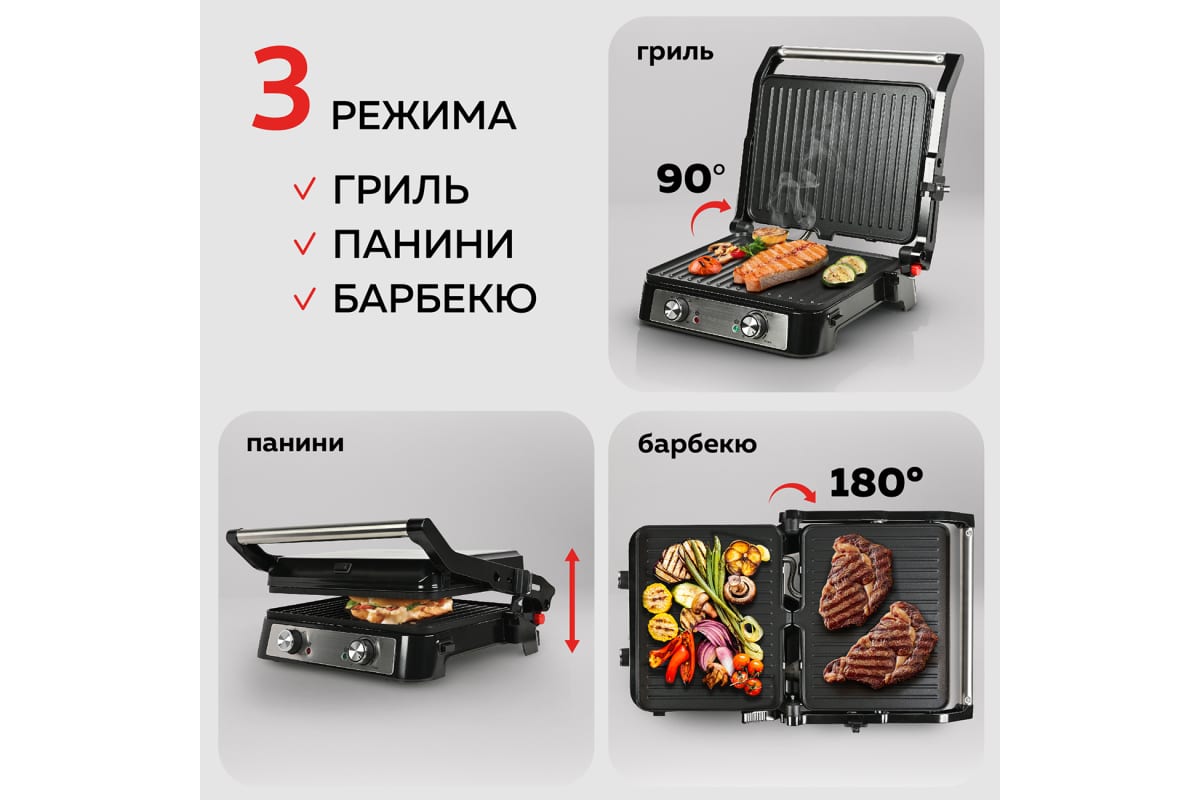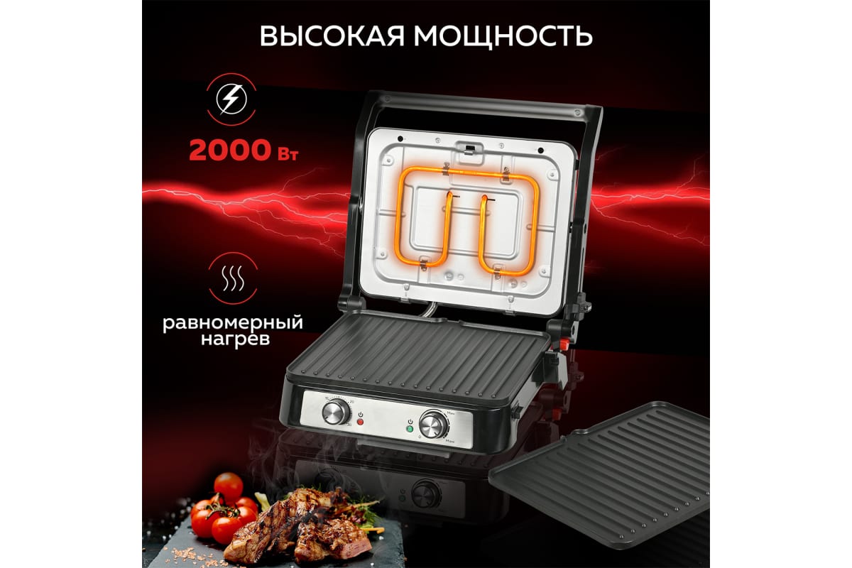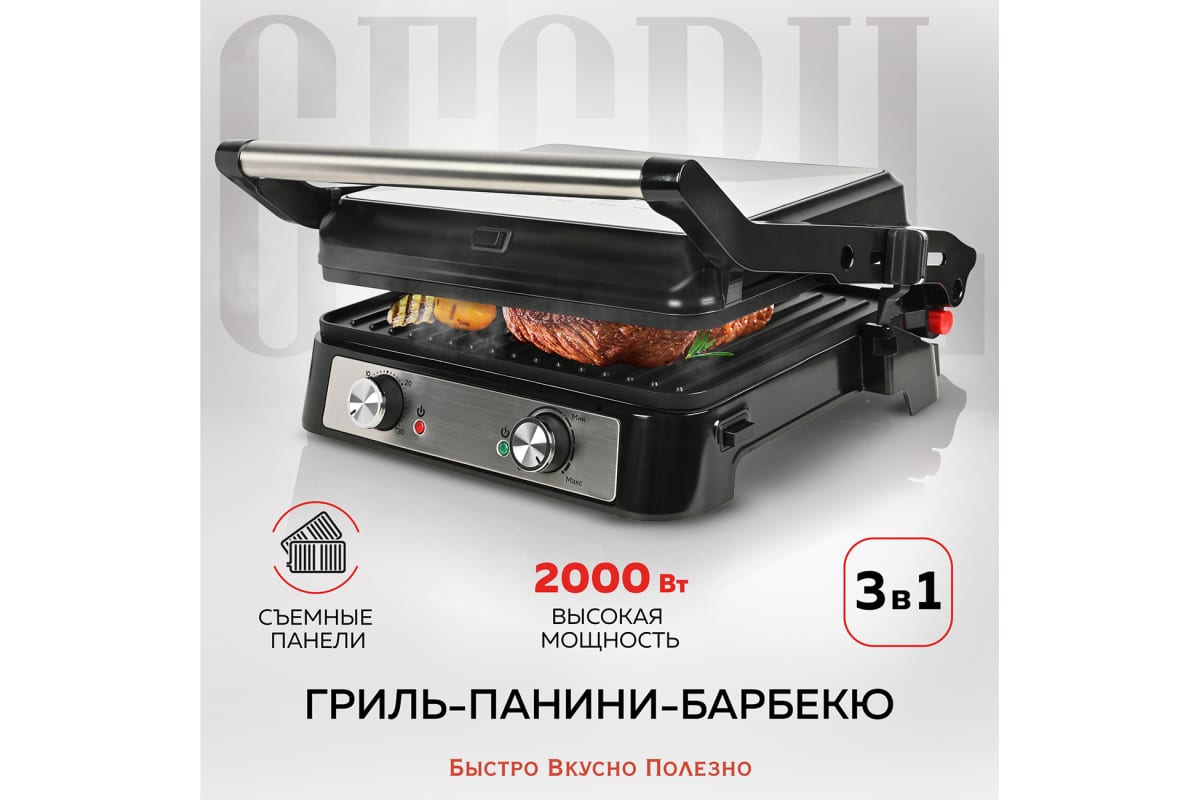 Гриль имеет высокая мощность - 2000 Вт, которая быстро разогреет рабочую поверхность прибора. Электрогриль с панелями с антипригарным покрытием позволяет готовить любимые блюда без добавления масла. Лишний жир вытапливается из продуктов во время приготовления и стекается по бороздкам панелей в специальный съемный лоток, который крепится в нижней части гриля. Наклон нижней поверхности гриля регулируется при помощи выдвижной подножки и способствует быстрому стеканию жира и лишней влаги. За счет этого продукты не варятся в собственном соку, а равномерно поджариваются до румяной корочки. Регулировка температуры приготовления 215-240 градусов. Также гриль электрический оснащен механическим таймером, с помощью которого можно установить необходимое время приготовления от 1 до 30 минут. Электрогриль со съемными пластинами также можно использовать в режиме барбекю, раскрыв на 180°, или настроить высоту закрытия крышки и готовить в режиме панини. Антипригарные панели гриля легко снимаются, их удобно мыть в посудомоечной машине. Размер панелей 29х23 см. Электрогриль со съемными панелями имеет фиксатор крышки, закрепляющий ее в исходном положении для безопасного и удобного вертикального хранения прибора. Плавающая замковая система верхней крышки подстраивается под нужную высоту продукта. Также можно настроить высоту закрытия крышки, выбрав одно из 8‑ми положений.