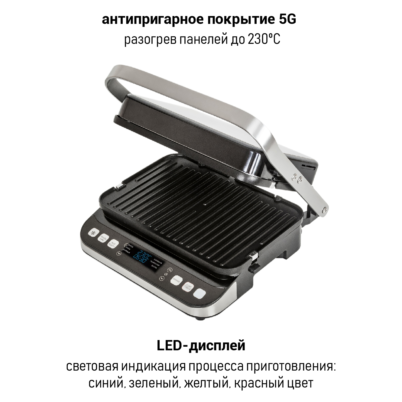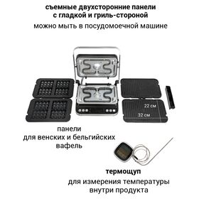 - Комплектация: электрический гриль, двухсторонние панели с гладкой и гриль стороной, панель для венских и бельгийских вафель, термощуп для измерения температуры внутри продукта, гарантийный талон, инструкция на русском