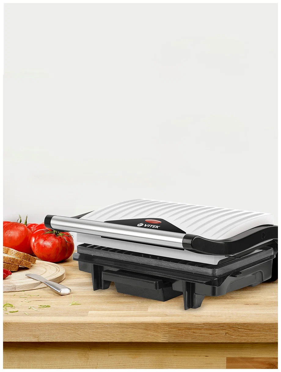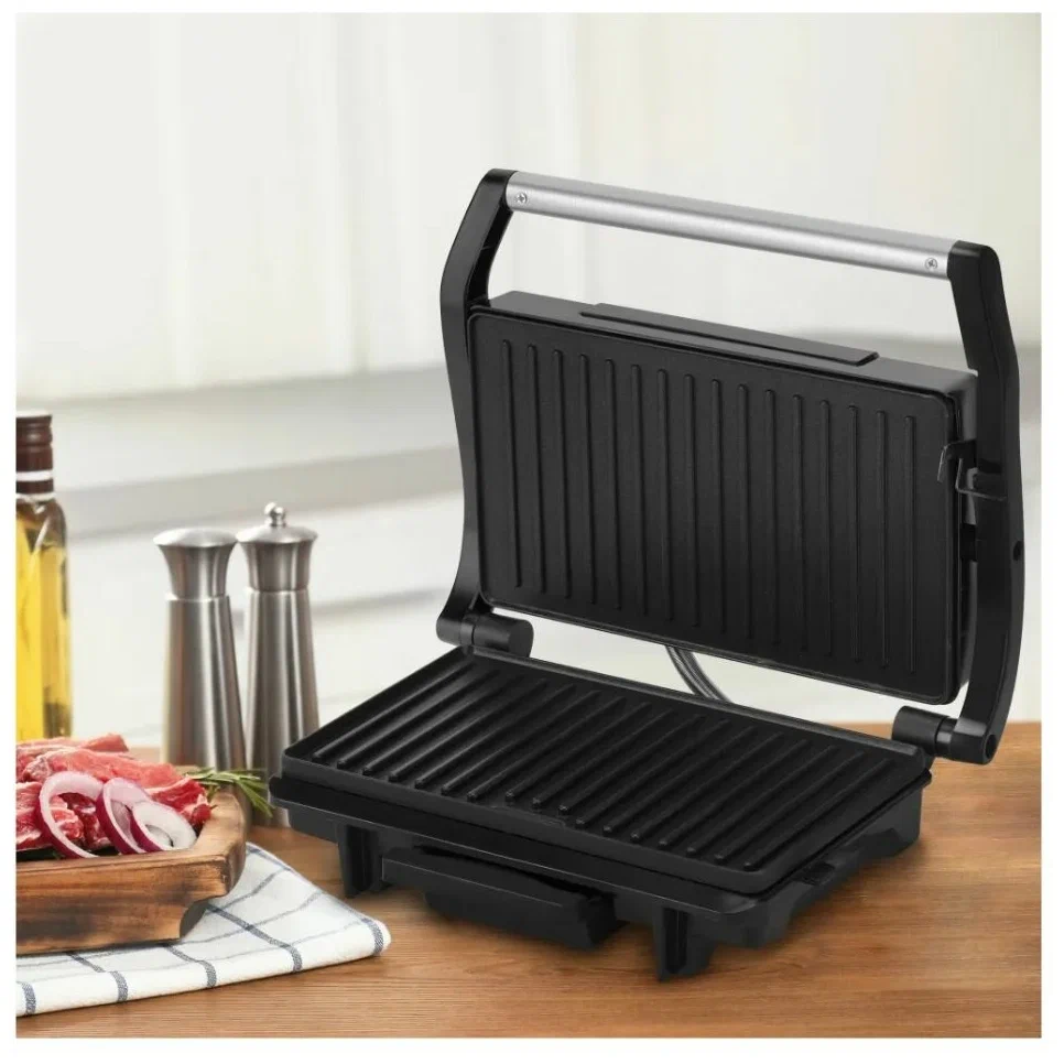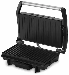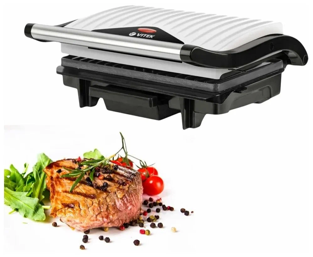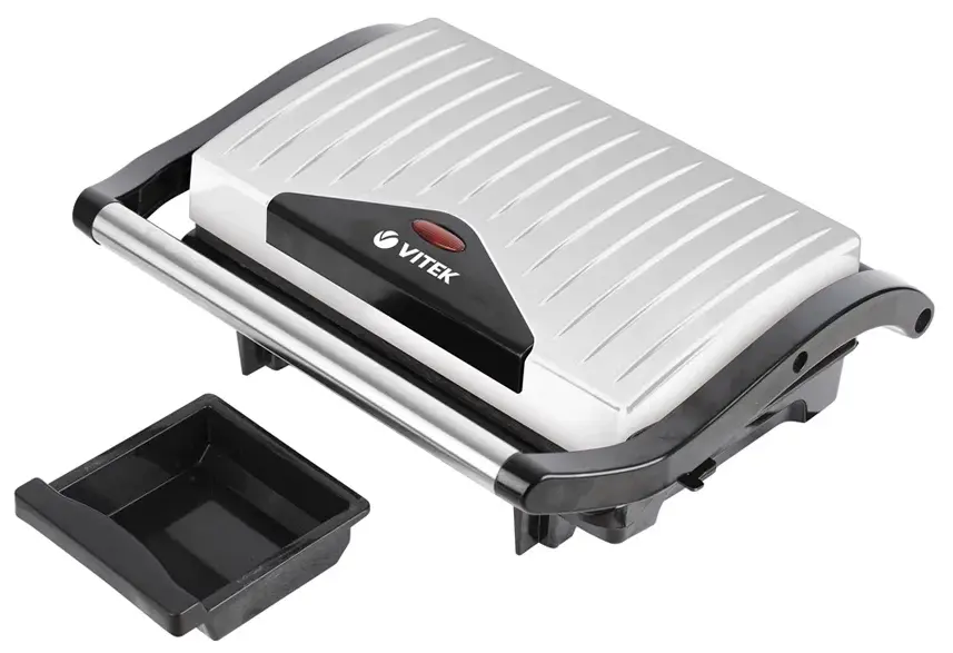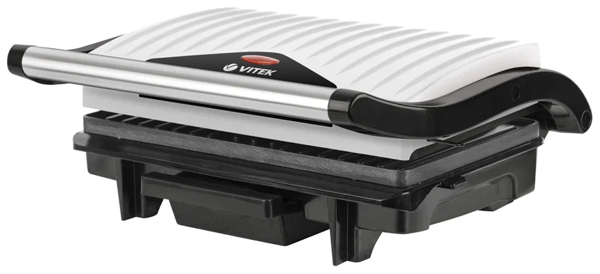 покрытие панелей антипригарное, регулировка температуры отсутствует, размер панелей 25 х 15,2 см, способ открытия крышки 105°, лоток для сбора масла встроенный, максимальная температура 190