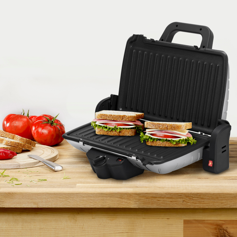 Наслаждайтесь сочным мясом и поджаренными овощами круглый год! Гриль-пресс работает от обычной розетки: достаточно положить продукты на поверхность прибора и закрыть крышку. Для удобства использования, гриль открывается на 180 и 90 градусов. Эта модель оснащена регулятором температуры для быстрой и удобной готовки (от 70 до 260 С)