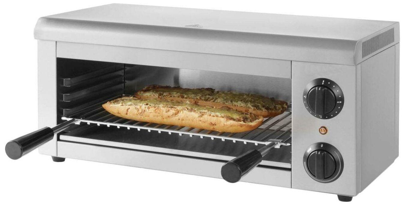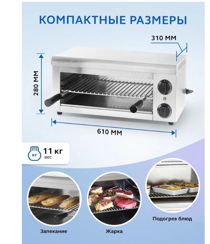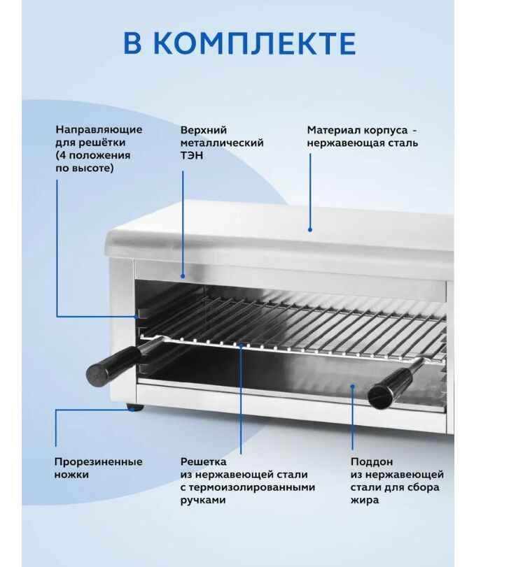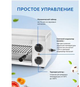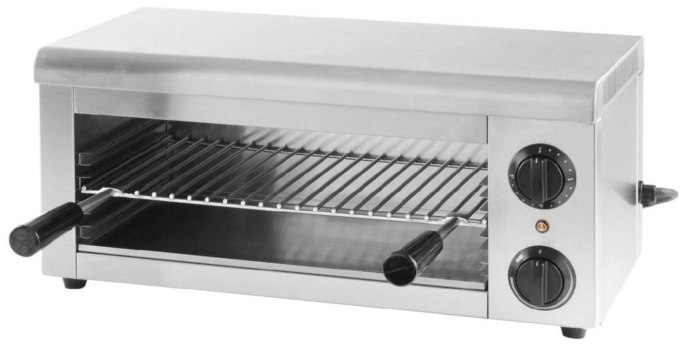 Гриль-саламандра Gastrorag AT-936E – это техника для приготовления блюд на профессиональной кухне. Электрический гриль саламандер для кафе относится к бесконтактному типу и имеет только верхний нагрев, который осуществляется металлическим нагревательным элементом. Электрогриль предназначен для запекания, доготовки блюд, придания им аппетитной золотистой корочки и поддержания в горячем состоянии до момента подачи посетителям. С его помощью можно приготовить курицу, стейки, гамбургеры, горячие бутерброды, тосты. Гриль саламандр электрический Gastrorag AT-936E отличается несложной конструкцией и простотой в эксплуатации. Он представляет собой закрытую с 3-х сторон камеру с четырьмя парами направляющих. Продукты размещаются на решетке, а направляющие позволяют регулировать ее высоту относительно нагревательного элемента, тем самым увеличивая или уменьшая интенсивность нагрева. Температура регулируется ручкой термостата в диапазоне 50-300оС. Предусмотрен также 15-минутный таймер. В нижней части камеры располагается съемный поддон для сбора жира и остатков пищи. Корпус гриля электрического открытого изготовлен из нержавеющей стали.