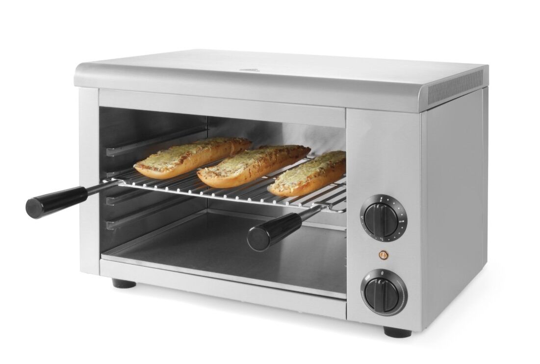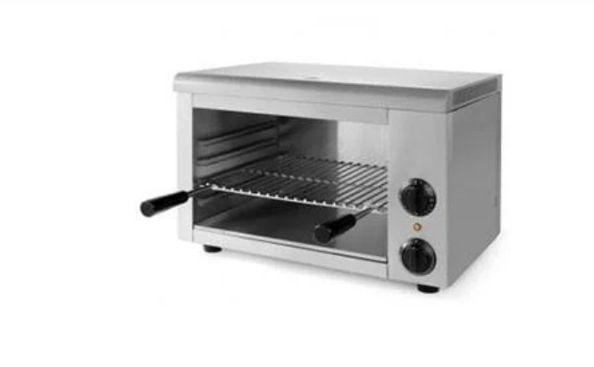 Гриль-саламандра Gastrorag AT-938E – это техника для приготовления блюд на профессиональной кухне. Электрический гриль саламандер для кафе относится к бесконтактному типу и имеет только верхний нагрев, который осуществляется металлическим нагревательным элементом. Электрогриль предназначен для запекания, доготовки блюд, придания им аппетитной золотистой корочки и поддержания в горячем состоянии до момента подачи посетителям. С его помощью можно приготовить курицу, стейки, горячие бутерброды, тосты. Гриль саламандр электрический Gastrorag AT-938E отличается несложной конструкцией и простотой в эксплуатации. Он представляет собой закрытую с 3-х сторон камеру с четырьмя парами направляющих. Продукты размещаются на решетке, а направляющие позволяют регулировать ее высоту относительно нагревательного элемента, тем самым увеличивая или уменьшая интенсивность нагрева. Температура регулируется ручкой термостата в диапазоне 50-300оС. Предусмотрен также 15-минутный таймер. В нижней части камеры располагается съемный поддон для сбора жира и остатков пищи. Корпус гриля электрического открытого изготовлен из нержавеющей стали.
