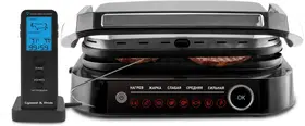 Температура нагрева 70-250 градусов С; толщина панелей 1,7 см; размер панелей 24,4х31,3; длина сетевого шнура 1 м; ручной режим; функциональные особенности: 3 в 1 - гриль, барбекю, запекание; комплектация: гриль, инструкция, гарантийный талон