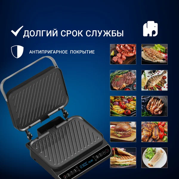 Режим барбекю, Таймер, Сенсорные кнопки, Звуковой сигнал, Защита от перегрева