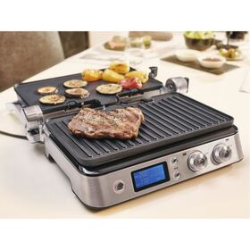 Электрогриль Braun CG9043 позволяет приготовить любые продукты: стейки, колбаски, гамбургеры, овощи или рыбу. Использование прибора простое и понятное: вся необходимая информация указана на дисплее. Эта модель работает в трех режимах: контактный гриль (с закрытой крышкой), открытая жаровня (крышка откинута) и «гриль-печь» (верхняя панель приподнята над нижней). Температура нагрева задается в диапазоне от 60 до 230 градусов отдельно для каждой поверхности при помощи поворотных регуляторов. Прибор оповестит о готовности к работе звуковым сигналом – пора приступать к закладке продуктов! Электрогриль оснащен нагревательными элементами с двух сторон, что обеспечивает равномерную прожарку блюд и румяную корочку. Наклон крышки можно регулировать.